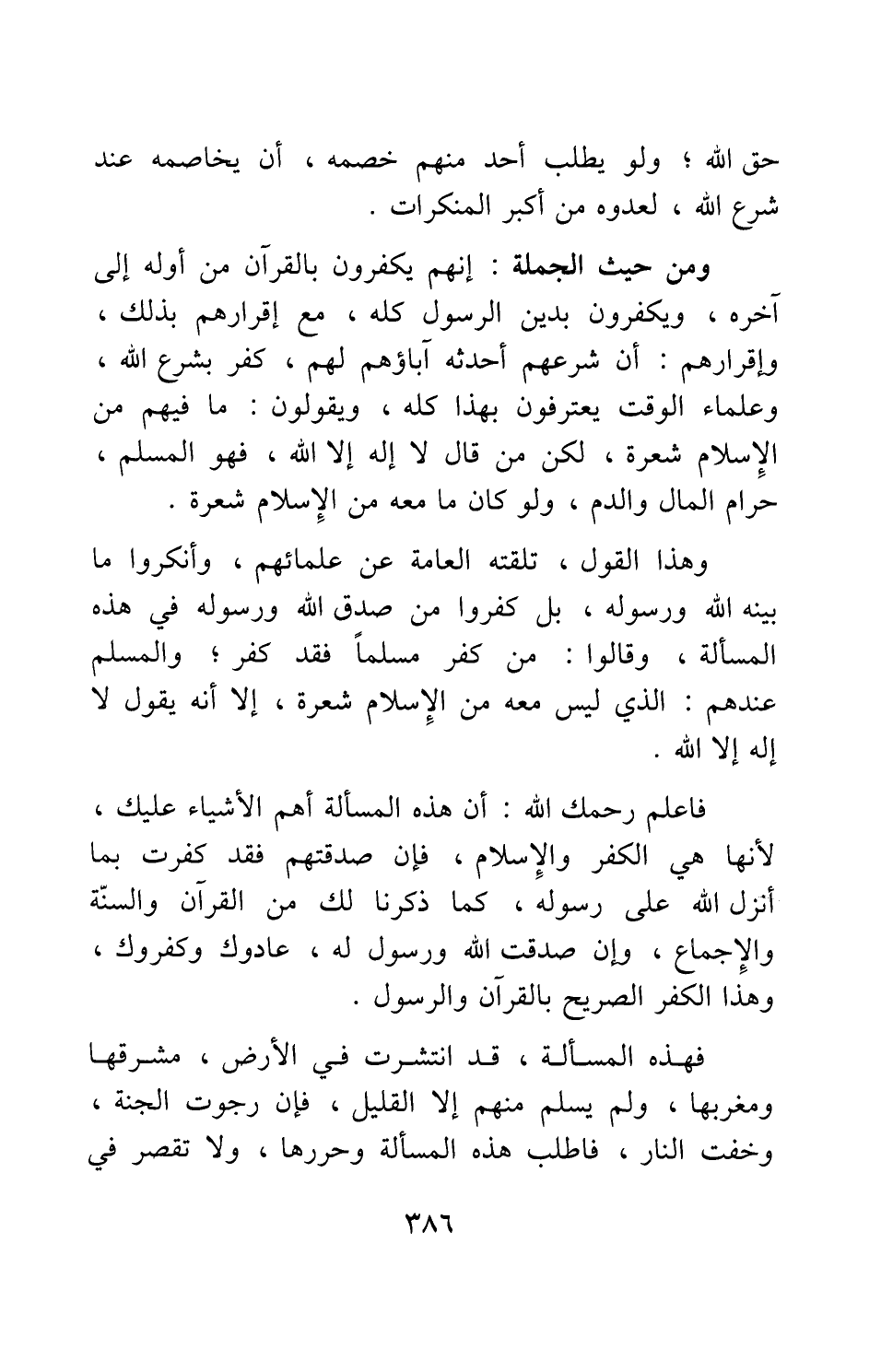 فهذه المسألة، قد انتشرت في الأرض، مشرقها ومغربها، ولم يسلم منهم إلا القليل؛ فإن رجوت الجنة، وخفت النار، فاطلب هذه المسألة وحررها، ولا تقصر في