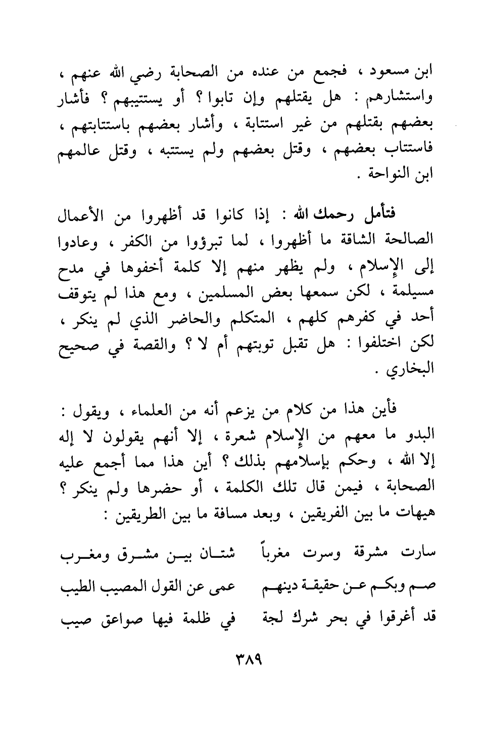 ابن مسعود، فجمع من عنده من الصحابة رضي الله عنهم، واستشارهم: هل يقتلهم وإن تابوا؟ أو يستتيب؟ فأشار بعض بقتلهم من غير استتابة، وأشار بعضهم باستتابتهم. فاستتاب بعضهم، وقتل بعضهم ولم يستتبه، وقتل عالمهم ابن النواحة. فتأمل رحمك الله: إذا كانوا قد أظهروا من الأعمال الصالحة الشاقة ما أظهروا، لما تبرؤوا من الكفر، وعادوا إلى الإسلام، ولم يظهر منهم إلا كلمة أخفوها في مدح مسيلمة، لكن سمعها بعض المسلمين، ومع هذا لم يتوقف أحد في كفرهم كلهم، المتكلم والحاضر الذي لم ينكر، لكن اختلفوا: هل تقبل توبتهم أم لا؟ والقصة في صحيح البخاري. فأين هذا من كلام من يزعم أنه من العلماء، ويقول: البدو ما معهم من الإسلام شعرة، إلا أنهم يقولون: لا إله إلا الله، وحكم بإسلامهم بذلك؟ أين هذا مما أجمع عليه الصحابة فيمن قال تلك الكلمة، أو حضرها ولم ينكر؟ هيهات ما بين الفريقين، وبعد مسافة ما بين الطريقين:
