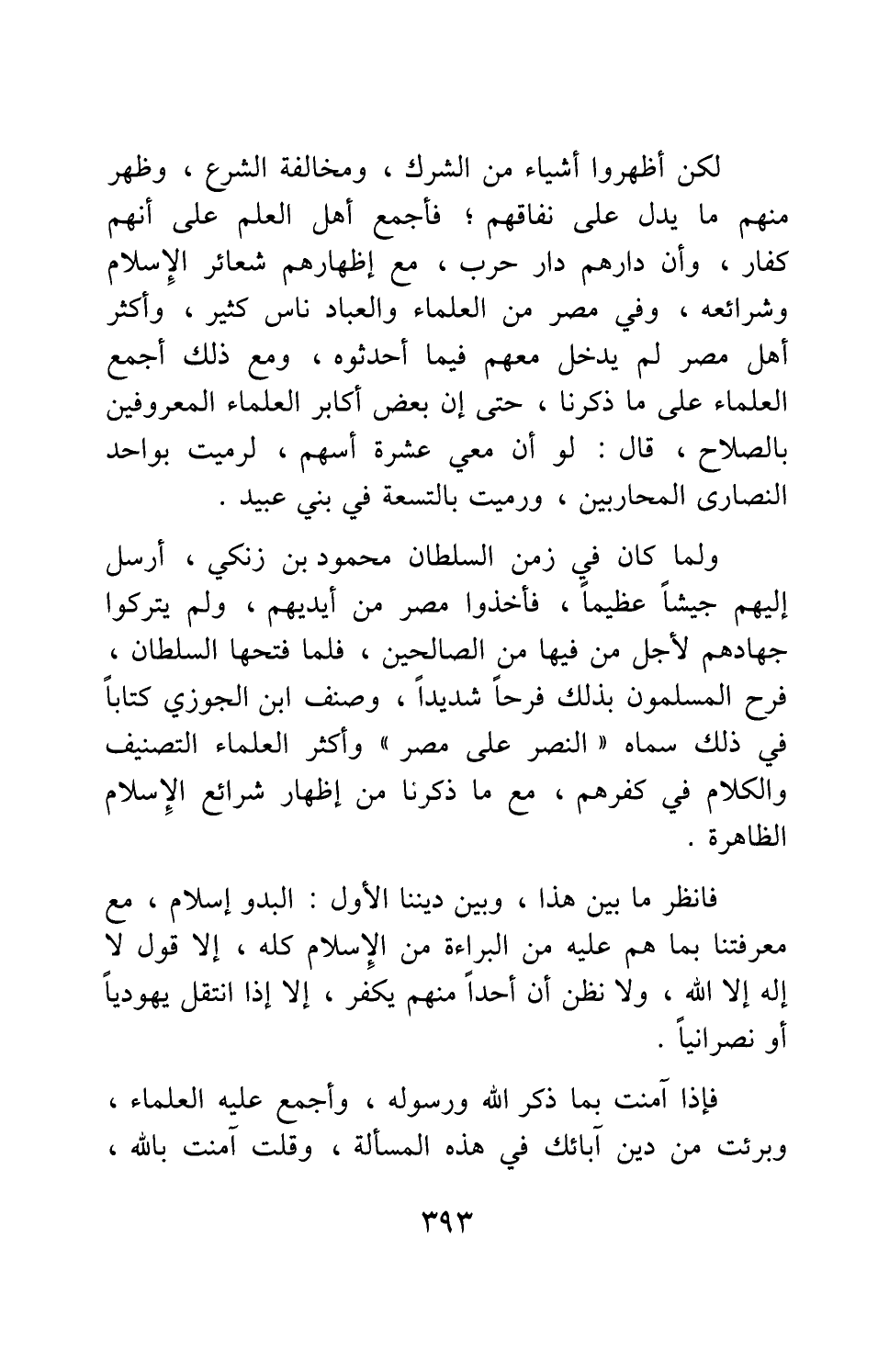 فانظر ما بين هذا، وبين ديننا الأول: البدو إسلام، مع معرفتنا بما هم عليه من البراءة من الإسلام كله، إلا قول لا إله إلا الله، ولا نظن أن أحدا منهم يكفر، إلا إذا انتقل يهوديا أو نصرانيا.