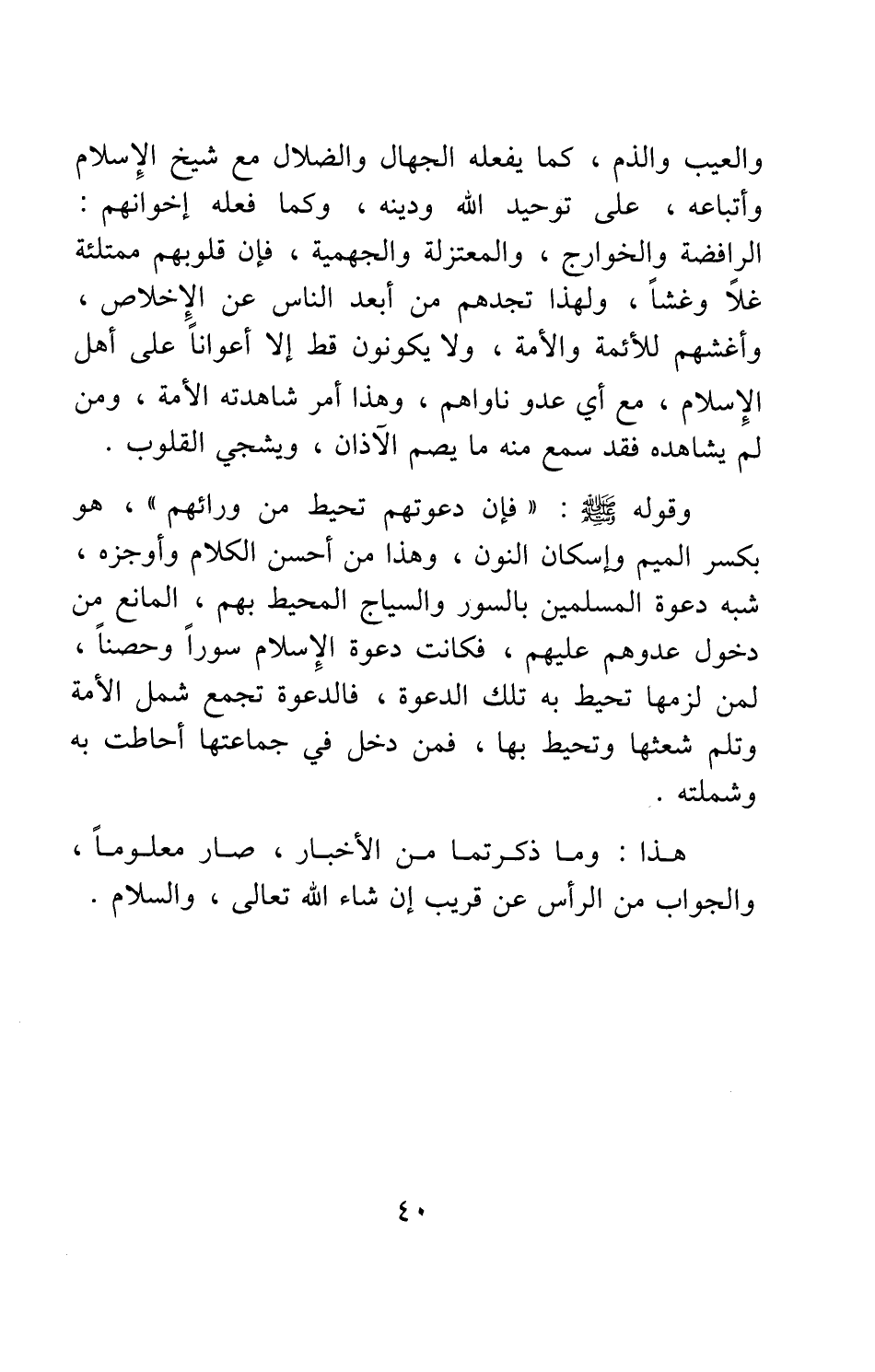 والعيب والذم، كما يفعله الجهال والضلاّل مع شيخ الإسلام وأتباعه، على توحيد الله ودينه، وكما فعله إخوانهم: الرافضة والخوارج، والمعتزلة والجهمية، فإن قلوبهم ممتلئة غلا وغشا، ولهذا تجدهم من أبعد الناس عن الإخلاص، وأغشهم للأئمة والأمة، ولا يكونون قط إلا أعوانا على أهل الإسلام، مع أي عدو ناوأهم، وهذا أمر شاهدته الأمة، ومن لم يشاهده فقد سمع منه ما يصم الآذان، ويشجي القلوب.