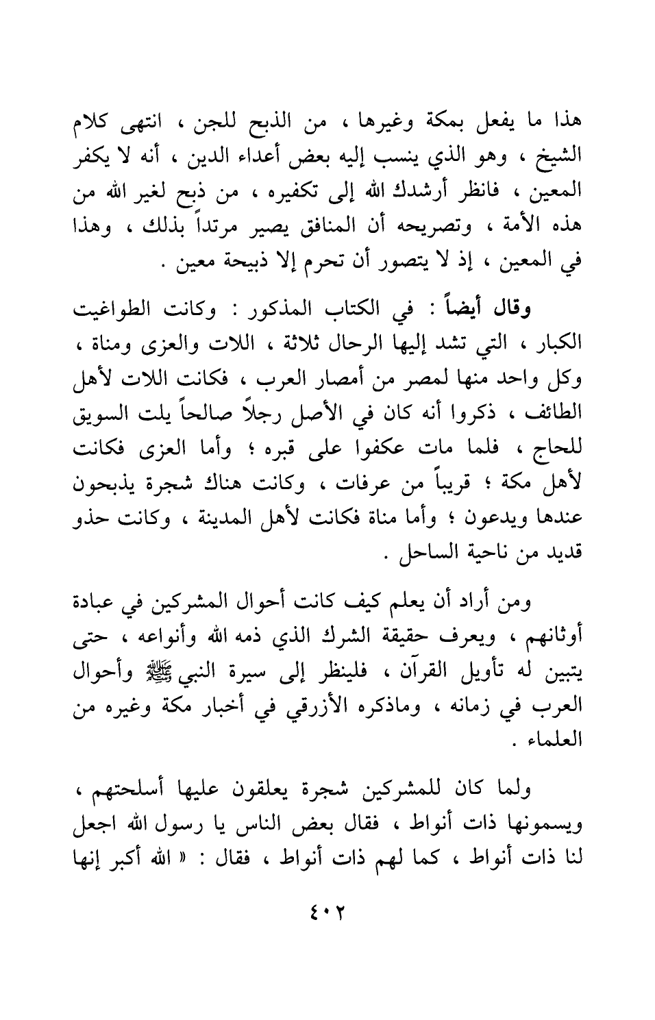 هذا ما يفعل بمكة وغيرها، من الذبح للجن، انتهى كلام الشيخ، وهو الذي ينسب إليه بعض أعداء الدين، أنه لا يكفر المعين. فانظر أرشدك الله إلى تكفيره، من ذبح لغير الله من هذه الأمة، وتصريحه أن المنافق يصير مرتدا لذلك، وهذا في المعين، إذ لا يتصور أن تحرم إلا ذبيحة معين.