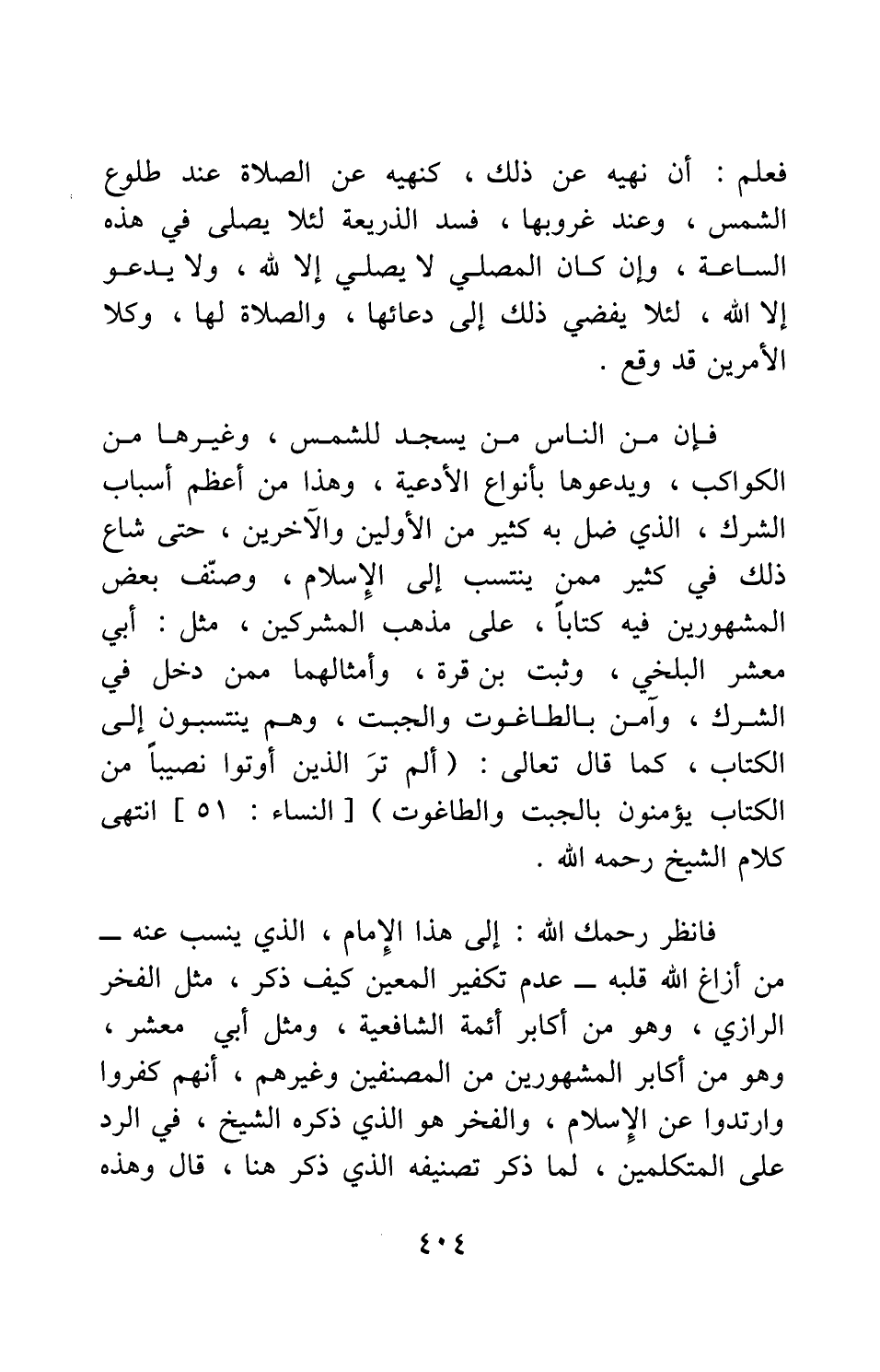 فانظر رحمك الله إلى هذا الإمام، الذي ينسب عنه - من أزاغ الله قلبه - عدم تكفير المعين، كيف ذكر مثل الفخر الرازي، وهو من أكابر أئمة الشافعية، ومثل أبي معشر، وهو من أكابر المشهورين من المصنفين وغيرهم، أنهم كفروا وارتدوا عن الإسلام، والفخر هو الذي ذكره الشيخ، في الرد على المتكلمين، لما ذكر تصنيفه الذي ذكر هنا، قال: وهذه