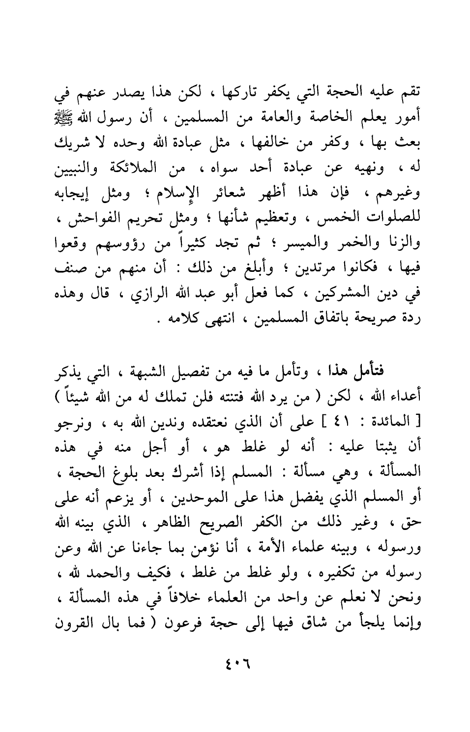 فتأمل هذا، وتأمل ما فيه من تفصيل الشبهة، التي يذكر أعداء الله، لكن {وَمَنْ يُرِدِ اللَّهُ فِتْنَتَهُ فَلَنْ تَمْلِكَ لَهُ مِنَ اللَّهِ شَيْئاً} [سورة المائدة آية: 41] ، على أن الذي نعتقده وندين الله به، ونرجو أن يثبتا عليه: أنه لو غلط هو، أو أجل منه في هذه المسألة، وهي مسألة: المسلم إذا أشرك بعد بلوغ الحجة، أو المسلم الذي يفضل هذا على الموحدين، أو يزعم أنه على حق، وغير ذلك من الكفر الصريح الظاهر، الذي بينه الله ورسوله، وبينه علماء الأمة، أنا نؤمن بما جاءنا عن الله وعن رسوله من تكفيره، ولو غلط من غلط، فكيف والحمد لله، ونحن لا نعلم عن واحد من العلماء خلافا في هذه المسألة، وإنما يلجأ من شاق فيها إلى حجة فرعون {قَالَ فَمَا بَالُ الْقُرُونِ