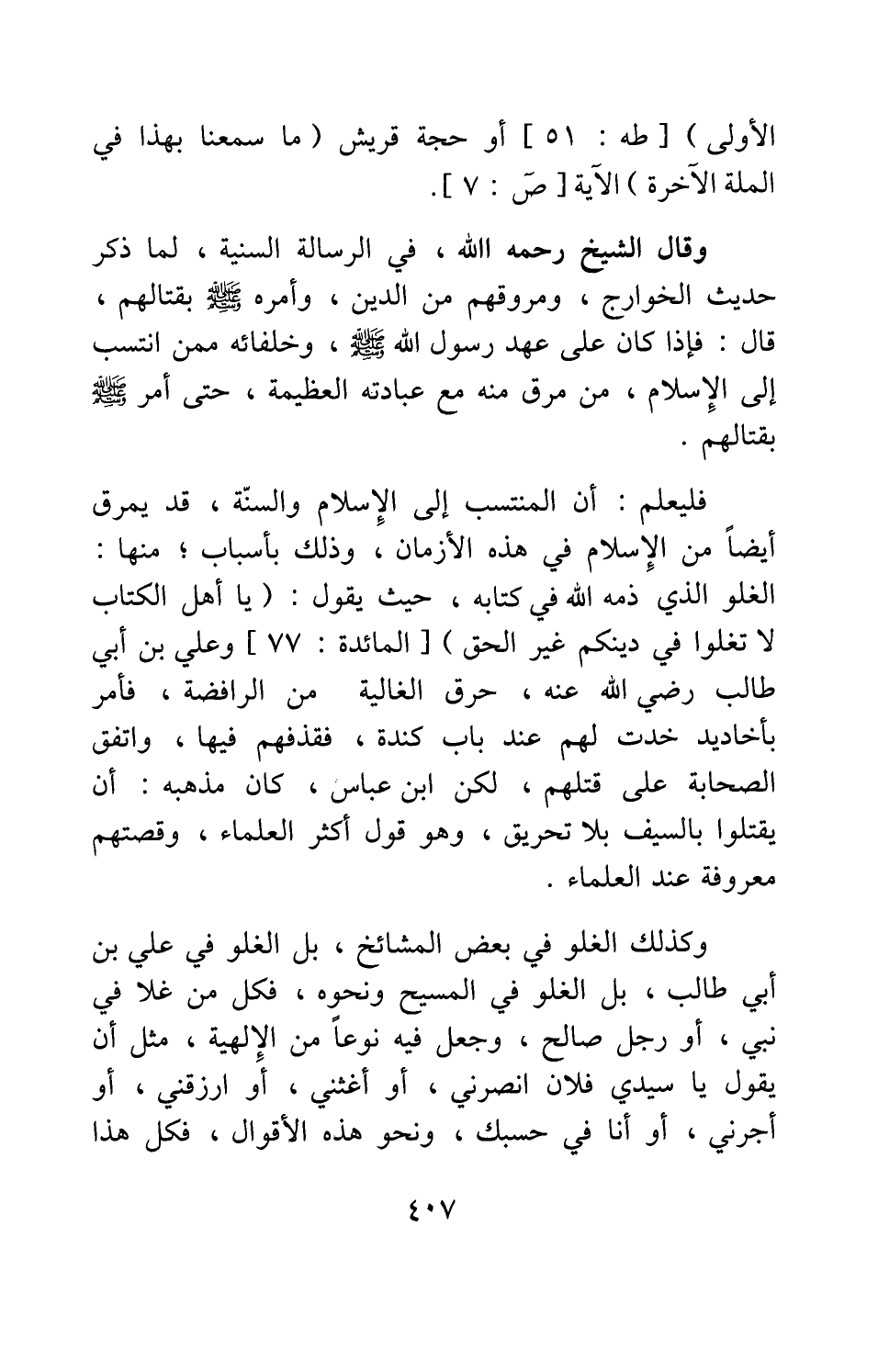 وقال الشيخ رحمه الله، في "الرسالة السنية"، لما ذكر حديث الخوارج، ومروقهم من الدين، وأمره صلى الله عليه وسلم بقتالهم، قال: فإذا كان على عهد رسول الله صلى الله عليه وسلم وخلفائه ممن انتسب إلى الإسلام، من مرق منه مع عبادته العظيمة، حتى أمر صلى الله عليه وسلم بقتالهم.