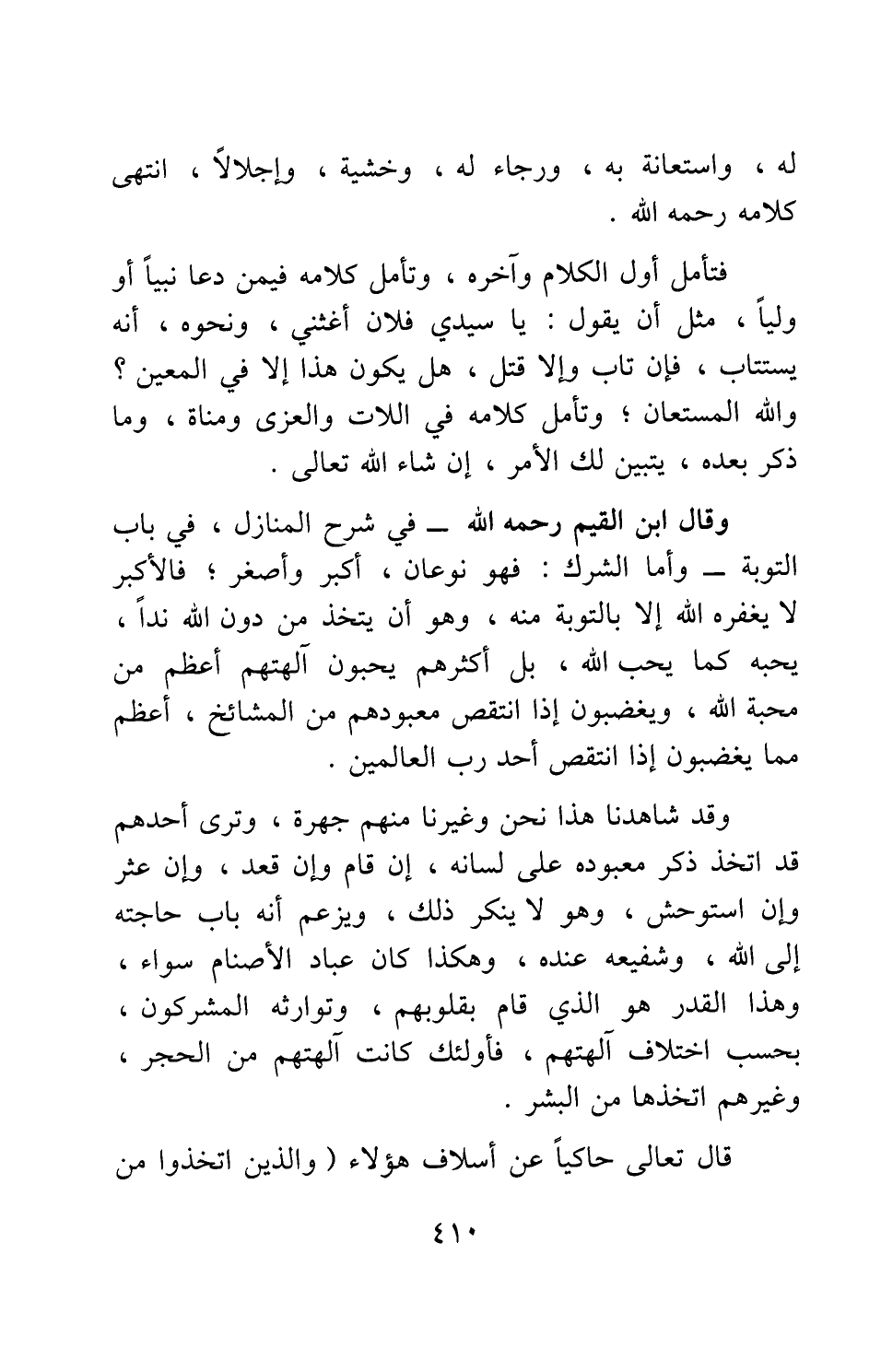 فتأمل أول الكلام وآخره، وتأمل كلامه فيمن دعا نبيا أو وليا، مثل أن يقول: يا سيدي فلان اغثني، ونحوه، أنه يستتاب، فإن تاب وإلا قتل، هل يكون هذا إلا في المعين؟ والله المستعان; وتأمل كلامه في اللات والعزّى ومناة، وما ذكر بعده، يتبين لك الأمر، إن شاء الله تعالى.