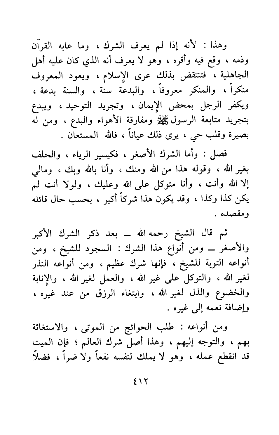 فصل: وأما الشرك الأصغر، فكيسير الرياء، والحلف بغير الله، وقوله: هذا من الله ومنك، وأنا بالله وبك، وما لي إلا الله وأنت، وأنا متوكل على الله وعليك، ولولا أنت لم يكن كذا وكذا؛ وقد يكون هذا شركا أكبر، بحسب حال قائله ومقصده.