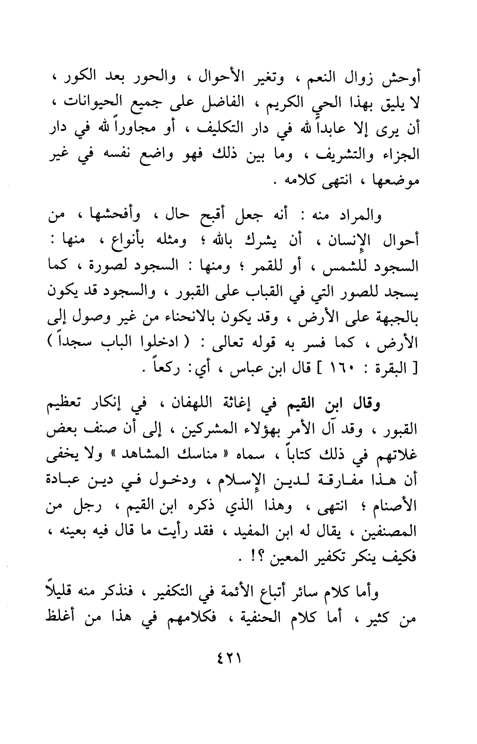 وقال ابن القيم في "إغاثة اللهفان"، في إنكار تعظيم القبور: وقد آل الأمر بهؤلاء المشركين، إلى أن صنف بعض غلاتهم في ذلك كتابا، سماه: "مناسك المشاهد"، ولا يخفى أن هذا مفارقة لدين الإسلام، ودخول في دين عبادة الأصنام; انتهى، وهذا الذي ذكره ابن القيم، رجل من المصنفين، يقال له ابن المفيد، فقد رأيت ما قال فيه بعينه، فكيف ينكر تكفير المعين؟!