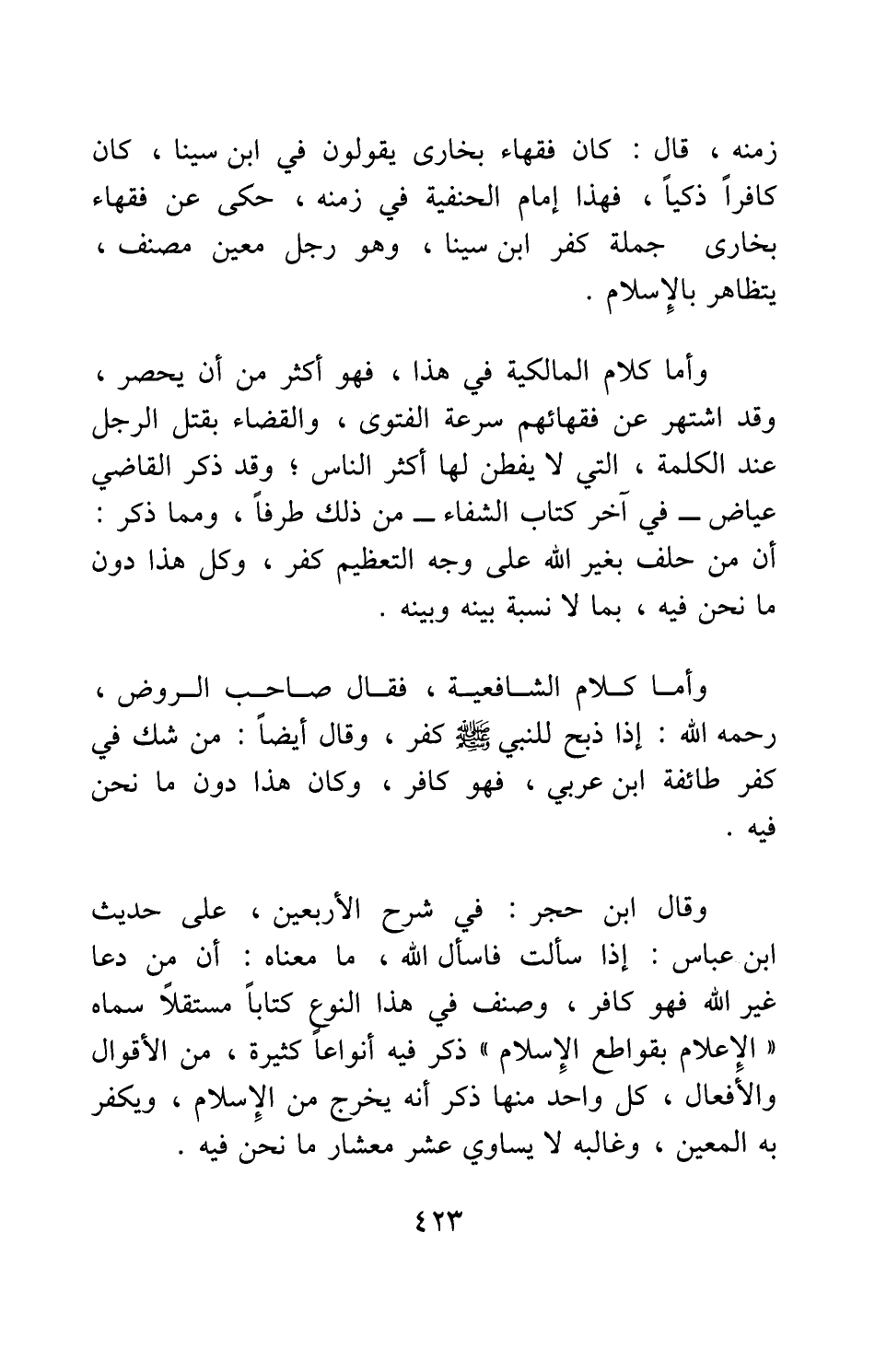 زمنه، قال: كان فقهاء بخارى يقولون في ابن سينا: كان كافرا ذكيا، فهذا إمام الحنفية في زمنه، حكى عن فقهاء بخارى جملة كفر ابن سينا، وهو رجل معين مصنف، يتظاهر بالإسلام.