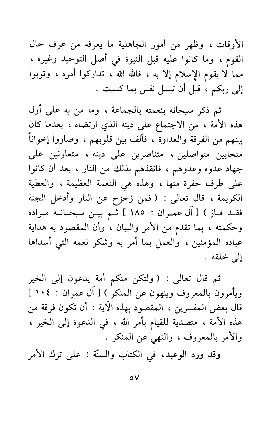 ثم قال تعالى: {وَلْتَكُنْ مِنْكُمْ أُمَّةٌ يَدْعُونَ إِلَى الْخَيْرِ وَيَأْمُرُونَ بِالْمَعْرُوفِ وَيَنْهَوْنَ عَنِ الْمُنْكَرِ} [سورة آل عمران آية: 104] قال بعض المفسرين: المقصود بهذه الآية: أن تكون فرقة من هذه الأمة، متصدية للقيام بأمر الله، في الدعوة إلى الخير، والأمر بالمعروف، والنهي عن المنكر.