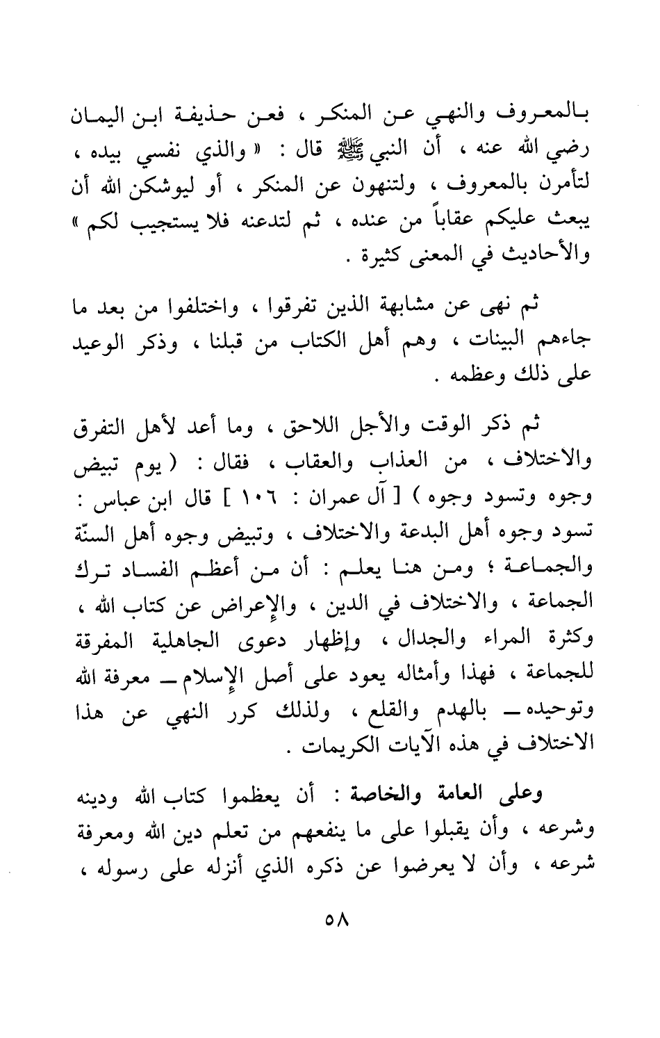 بالمعروف والنهي عن المنكر، فعن حذيفة بن اليمان رضي الله عنه أن النبي صلى الله عليه وسلم قال: " والذي نفسي بيده، لتأمرن بالمعروف، ولتنهون عن المنكر، أو ليوشكن الله أن يبعث عليكم عقابا من عنده، ثم لتدعنه فلا يستجيب لكم " " 1 والأحاديث في المعنى كثيرة.