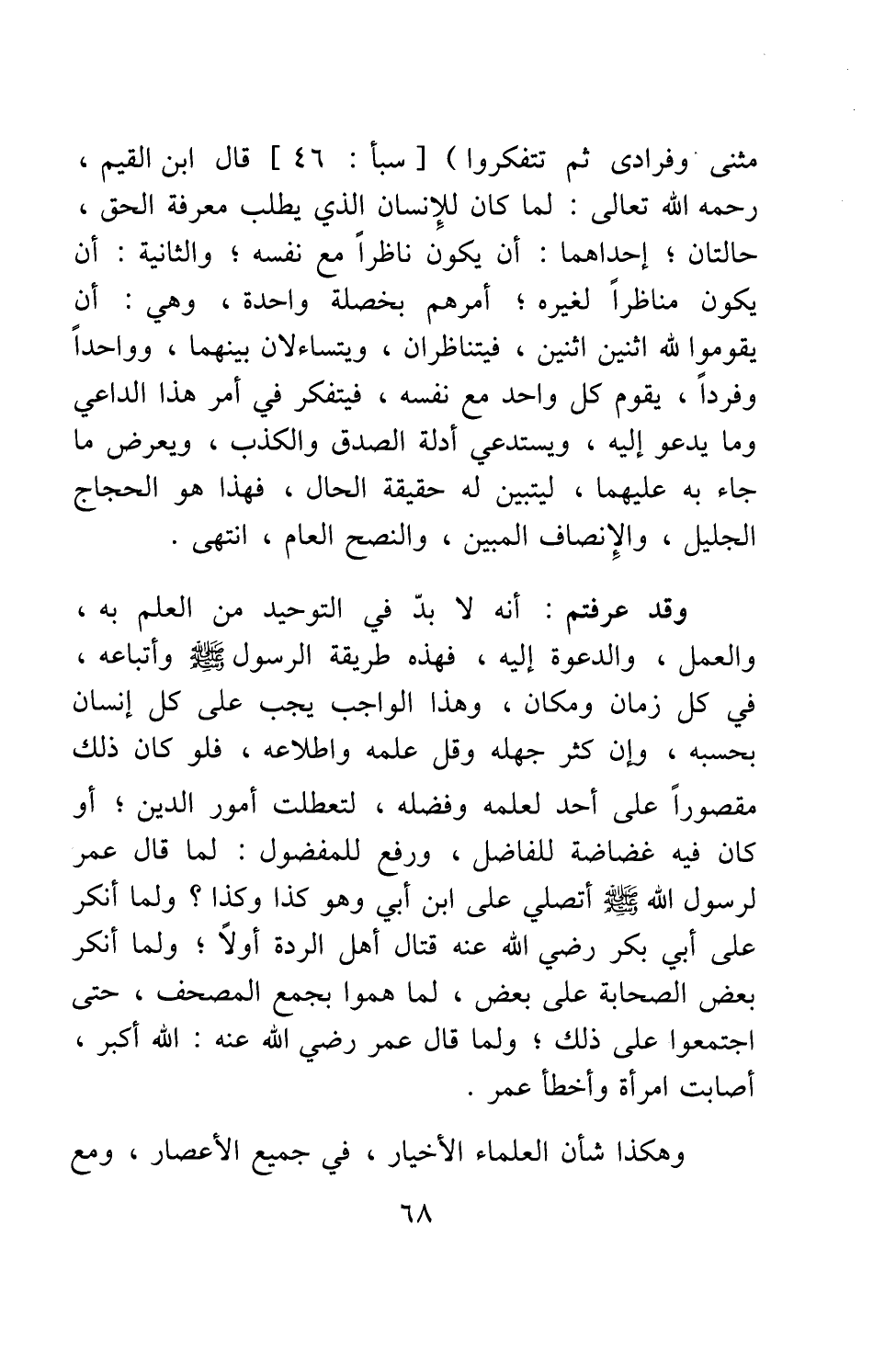 وقد عرفتم: أنه لا بد في التوحيد من العلم به والعمل، والدعوة إليه، فهذه طريقة الرسول صلى الله عليه وسلم وأتباعه، في كل زمان ومكان، وهذا الواجب يجب على كل إنسان بحسبه، وإن كثر جهله وقل علمه واطلاعه، فلو كان ذلك مقصورا على أحد لعلمه وفضله، لتعطلت أمور الدين; أو كان فيه غضاضة للفاضل، ورفع للمفضول لما قال عمر لرسول الله صلى الله عليه وسلم: أتصلي على ابن أبي وهو كذا وكذا؟ ولما أنكر على أبي بكر رضي الله عنه قتال أهل الردة أولا; ولما أنكر بعض الصحابة على بعض، لما هموا بجمع المصحف، حتى اجتمعوا على ذلك; ولما قال عمر رضي الله عنه " الله أكبر! أصابت امرأة وأخطأ عمر ".