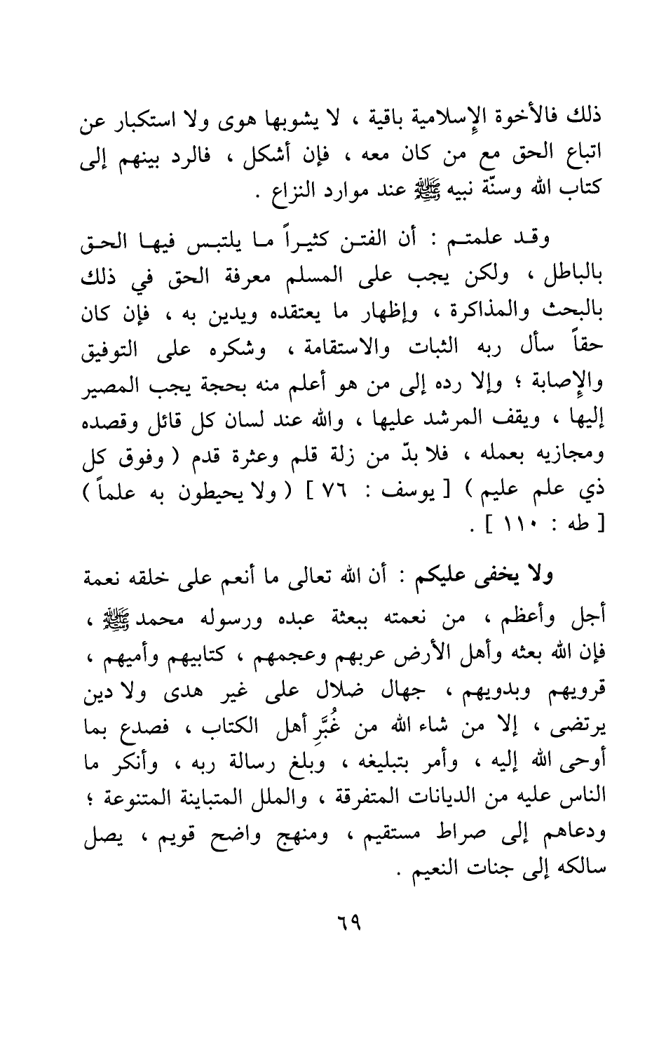 وقد علمتم أن الفتن كثيرا ما يلتبس فيها الحق بالباطل، ولكن يجب على المسلم معرفة الحق في ذلك بالبحث والمذاكرة، وإظهار ما يعتقده ويدين به، فإن كان حقا سأل ربه الثبات والاستقامة، وشكره على التوفيق والإصابة; وإلا رده إلى من هو أعلم منه بحجة يجب المصير إليها، ويقف المرشد عليها، والله عند لسان كل قائل وقصده ومجازيه بعمله، فلا بد من زلة قلم وعثرة قدم {وَفَوْقَ كُلِّ ذِي عِلْمٍ عَلِيمٌ} [سورة يوسف آية: 76] {وَلا يُحِيطُونَ بِهِ عِلْماً} [سورة طه آية: 110] .