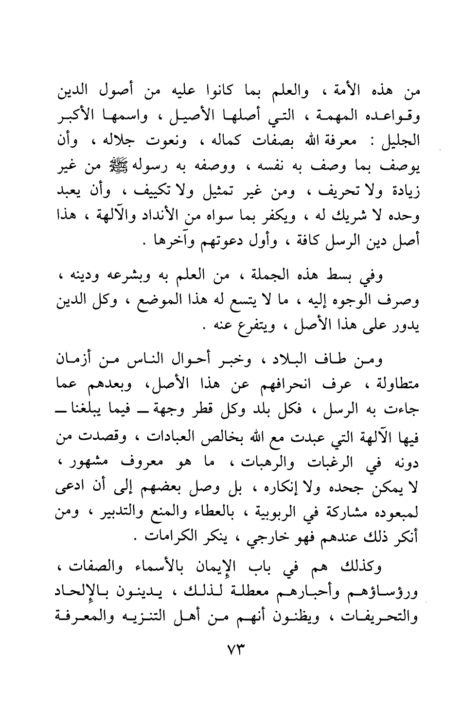 من هذه الأمة، والعلم بما كانوا عليه من أصول الدين وقواعده المهمة، التي أصلها الأصيل، واسمها الأكبر الجليل: معرفة الله بصفات كماله، ونعوت جلاله، وأن يوصف بما وصف به نفسه، ووصفه به رسوله صلى الله عليه وسلم من غير زيادة ولا تحريف، ومن غير تمثيل ولا تكييف، وأن يعبد وحده لا شريك له، ويكفر بما سواه من الأنداد والآلهة، هذا أصل دين الرسل كافة، وأول دعوتهم وآخرها.