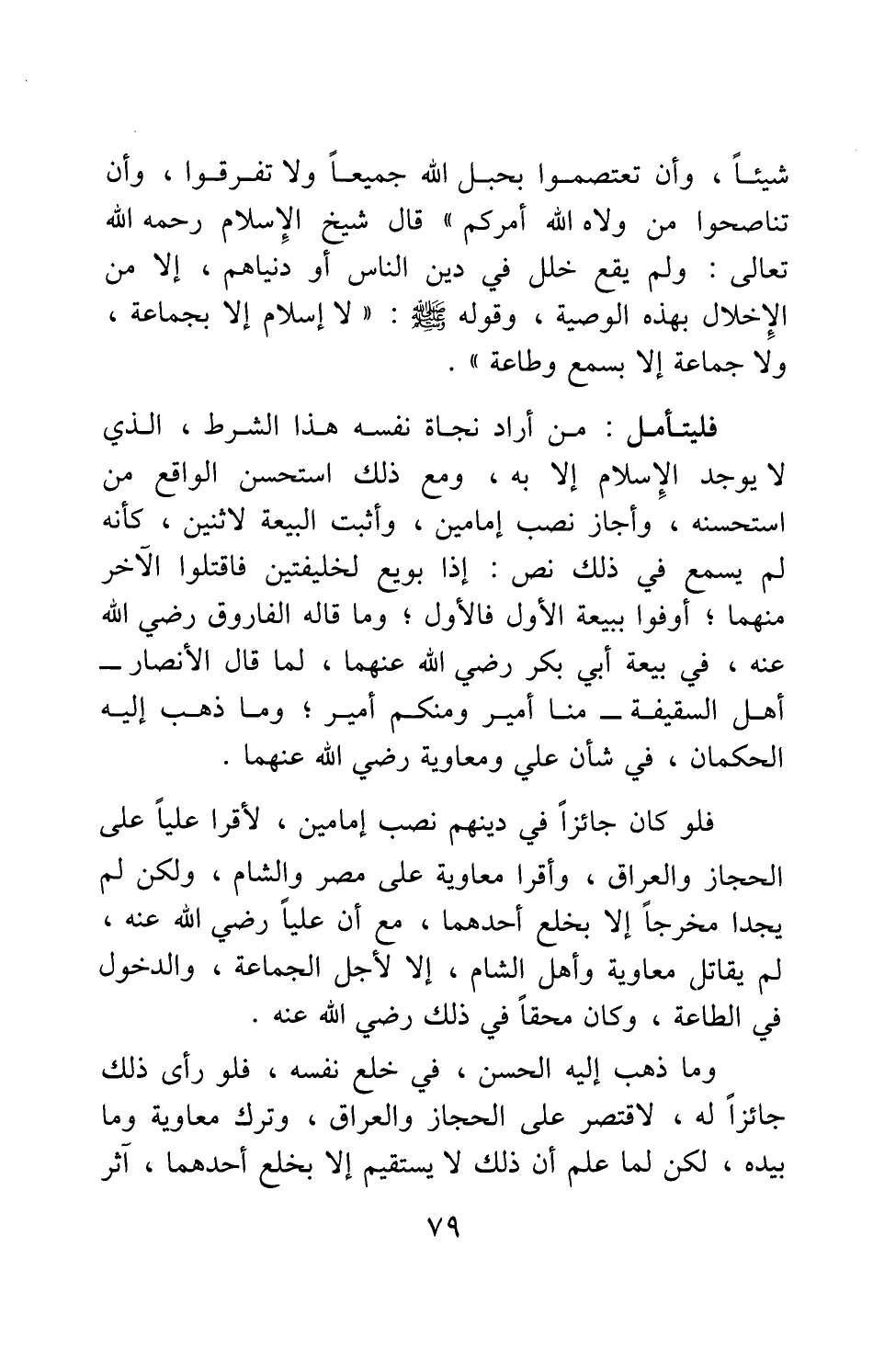 فلو كان جائزا في دينهم نصب إمامين، لأقرا عليا على الحجاز والعراق، وأقرا معاوية على مصر والشام، ولكن لم يجدا مخرجا إلا بخلع أحدهما، مع أن عليا رضي الله عنه لم يقاتل معاوية وأهل الشام، إلا لأجل الجماعة، والدخول في الطاعة، وكان محقا في ذلك رضي الله عنه.