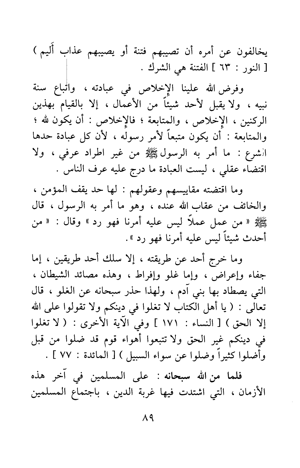 وفرض الله علينا الإخلاص في عبادته، واتباع سنة نبيه، ولا يقبل لأحد شيئا من الأعمال، إلا بالقيام بهذين الركنين، الإخلاص، والمتابعة; فالإخلاص: أن يكون لله; والمتابعة: أن يكون متبعا لأمر رسوله، لأن كل عبادة حدها الشرع: ما أمر به الرسول صلى الله عليه وسلم من غير إطراد عرفي، ولا اقتضاء عقلي، ليست العبادة ما درج عليه عرف الناس، وما اقتضته مقاييسهم وعقولهم: لها حد يقف المؤمن، والخائف من عقاب الله عنده، وهو ما أمر به الرسول، قال صلى الله عليه وسلم " من عمل عملا ليس عليه أمرنا فهو رد "1 وقال: " من أحدث شيئا ليس عليه أمرنا فهو رد " 2 وما خرج أحد عن طريقته، إلا سلك أحد طريقين، إما جفاء وإعراض، وإما غلو وإفراط، وهذه مصائد الشيطان، التي يصطاد بها بني آدم، ولهذا حذر سبحانه عن الغلو، قال تعالى: {يَا أَهْلَ الْكِتَابِ لا تَغْلُوا فِي دِينِكُمْ وَلا تَقُولُوا عَلَى اللَّهِ الاَّ الْحَقَّ} [سورة النساء آية: 171] وفي الآية الأخرى: {لا تَغْلُوا فِي دِينِكُمْ غَيْرَ الْحَقِّ وَلا تَتَّبِعُوا أَهْوَاءَ قَوْمٍ قَدْ ضَلُّوا مِنْ قَبْلُ وَأَضَلُّوا كَثِيراً وَضَلُّوا عَنْ سَوَاءِ السَّبِيلِ} [سورة المائدة آية: 77] .