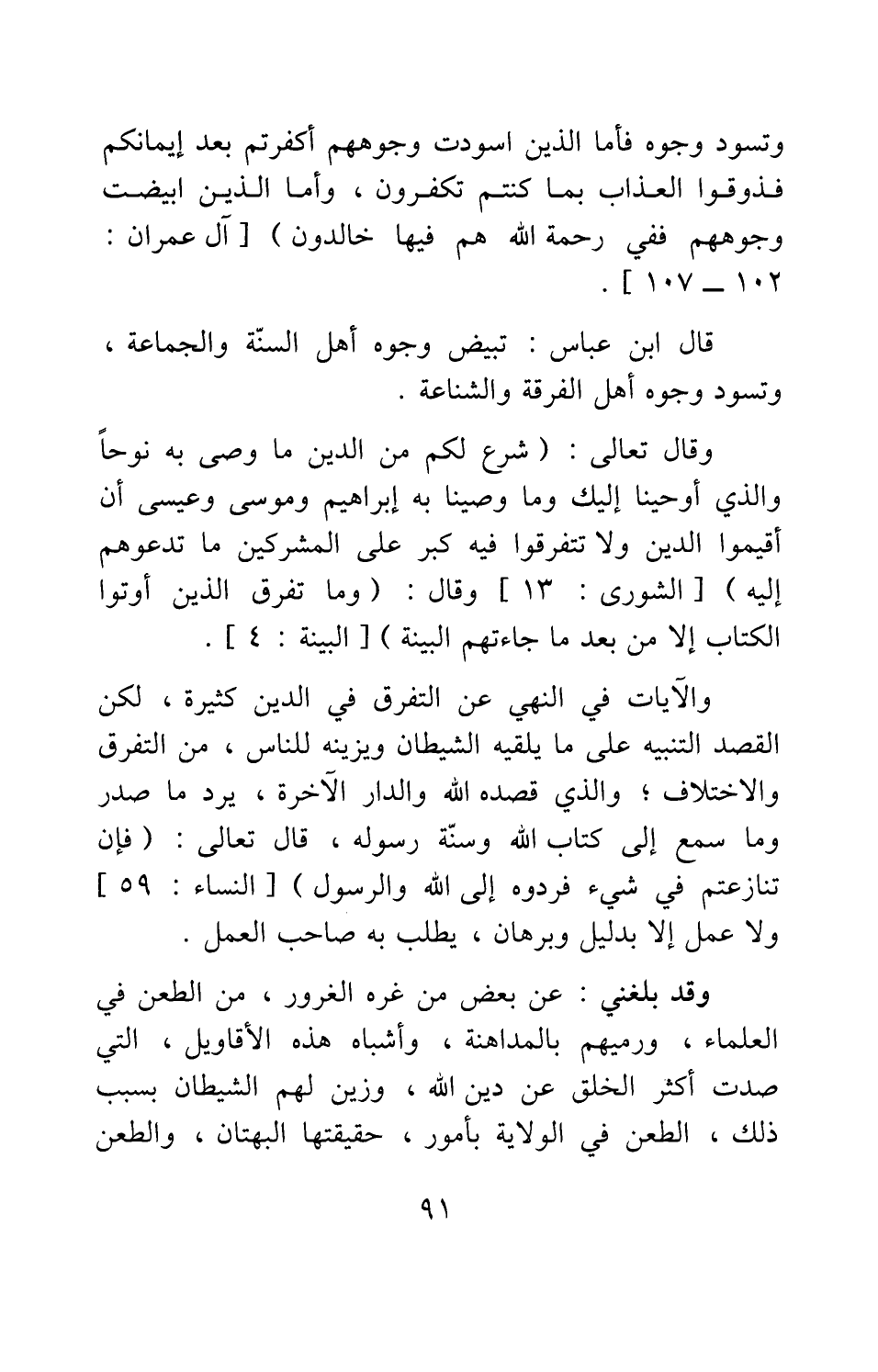 وَتَسْوَدُّ وُجُوهٌ فَأَمَّا الَّذِينَ اسْوَدَّتْ وُجُوهُهُمْ أَكَفَرْتُمْ بَعْدَ إِيمَانِكُمْ فَذُوقُوا الْعَذَابَ بِمَا كُنْتُمْ تَكْفُرُونَ وَأَمَّا الَّذِينَ ابْيَضَّتْ وُجُوهُهُمْ فَفِي رَحْمَةِ اللَّهِ هُمْ فِيهَا خَالِدُونَ} [سورة آل عمران آية: 105-107] قال ابن عباس: تبيض وجوه أهل السنة والجماعة، وتسود وجوه أهل الفرقة والشناعة.