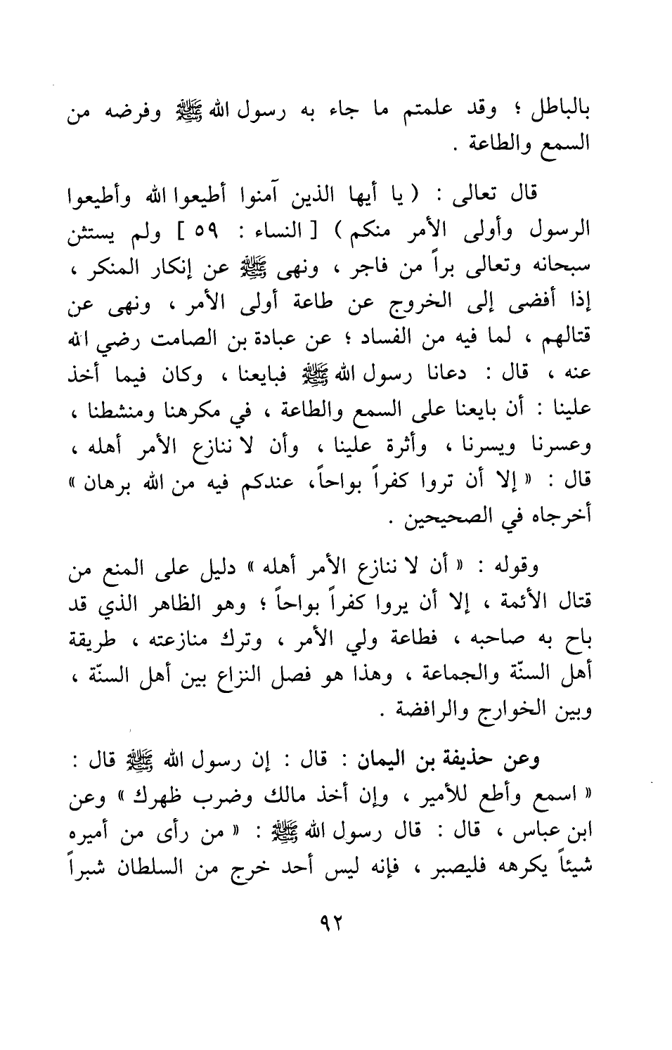 قال تعالى: {يَا أَيُّهَا الَّذِينَ آمَنُوا أَطِيعُوا اللَّهَ وَأَطِيعُوا الرَّسُولَ وَأُولِي الأَمْرِ مِنْكُمْ} [سورة النساء آية: 59] ولم يستثن سبحانه وتعالى برا من فاجر، ونهى صلى الله عليه وسلم عن إنكار المنكر، إذا أفضى إلى الخروج عن طاعة أولي الأمر، ونهى عن قتالهم، لما فيه من الفساد; عن عبادة بن الصامت رضي الله عنه "قال: دعانا رسول الله صلى الله عليه وسلم فبايعنا، وكان فيما أخذ علينا: أن بايعنا على السمع والطاعة، في مكرهنا ومنشطنا، وعسرنا ويسرنا، وأثرة علينا، وأن لا ننازع الأمر أهله، قال: " إلا أن تروا كفرا بواحا، عندكم فيه من الله برهان " 1 أخرجاه في الصحيحين.