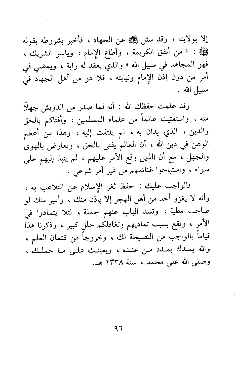 فالواجب عليك: حفظ ثغر الإسلام عن التلاعب به، وأنه لا يغزو أحد من أهل الهجر إلا بإذن منك، وأمير منك لو صاحب مطية، وتسد الباب عنهم جملة، لئلا يتمادوا في الأمر، ويقع بسبب تماديهم وتغافلكم خلل كبير، وذكرنا هذا قياما بالواجب من النصيحة لك، وخروجا من كتمان العلم، والله يمدك بمدد من عنده، ويعينك على ما حملك، وصلى الله على محمد، سنة 1338 هـ.