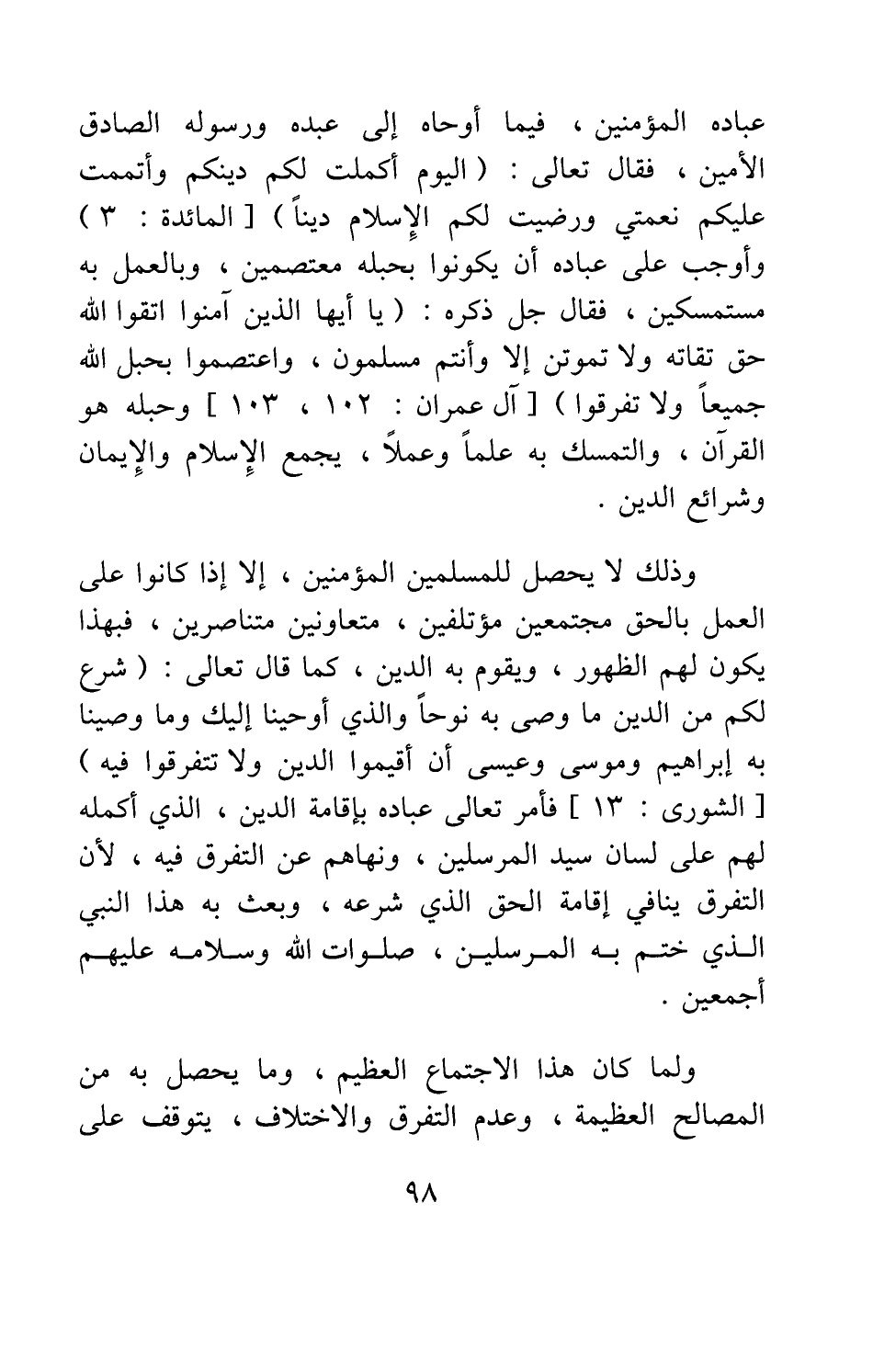عباده المؤمنين، فيما أوحاه إلى عبده ورسوله الصادق الأمين، فقال تعالى: {الْيَوْمَ أَكْمَلْتُ لَكُمْ دِينَكُمْ وَأَتْمَمْتُ عَلَيْكُمْ نِعْمَتِي وَرَضِيتُ لَكُمُ الأِسْلامَ دِيناً} [سورة المائدة آية: 3] وأوجب على عباده أن يكونوا بحبله معتصمين، وبالعمل به مستمسكين، فقال جل ذكره: {يَا أَيُّهَا الَّذِينَ آمَنُوا اتَّقُوا اللَّهَ حَقَّ تُقَاتِهِ وَلا تَمُوتُنَّ إِلاَّ وَأَنْتُمْ مُسْلِمُونَ وَاعْتَصِمُوا بِحَبْلِ اللَّهِ جَمِيعاً وَلا تَفَرَّقُوا} [سورة آل عمران آية: 102] وحبله هو القرآن، والتمسك به علما وعملا، يجمع الإسلام والإيمان وشرائع الدين.
