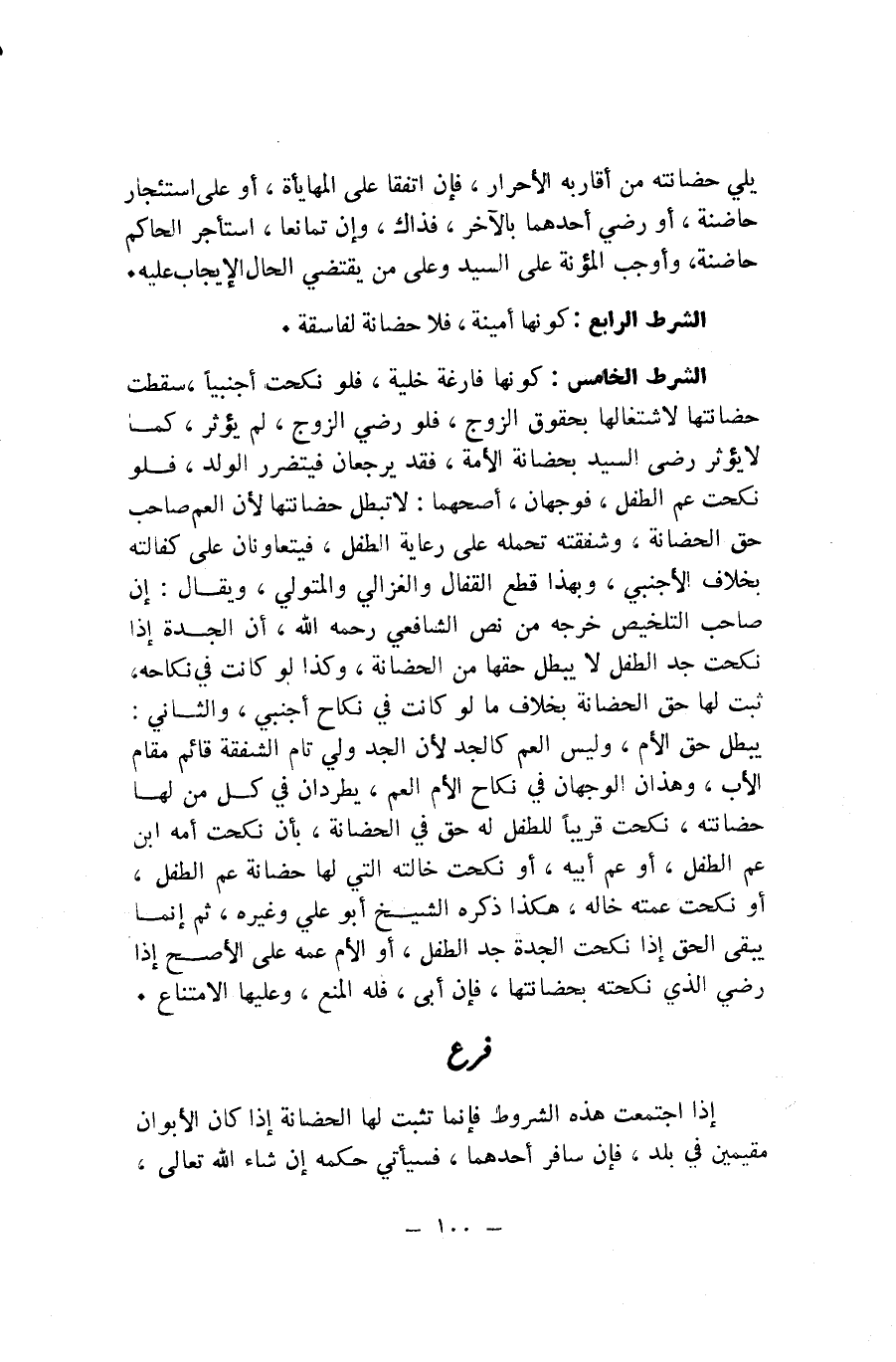 الشَّرْطُ الْخَامِسُ: كَوْنُهَا فَارِغَةً خَلِيَّةً، فَلَوْ نَكَحَتْ أَجْنَبِيًّا، سَقَطَتْ حَضَانَتُهَا لِاشْتِغَالِهَا بِحُقُوقِ الزَّوْجِ، فَلَوْ رَضِيَ الزَّوْجُ، لَمْ يُؤَثِّرْ، كَمَا لَا يُؤَثِّرُ رِضَا السَّيِّدِ بِحَضَانَةِ الْأَمَةِ، فَقَدْ يَرْجِعَانِ فَيَتَضَرَّرُ الْوَلَدُ، فَلَوْ نَكَحَتْ عَمَّ الطِّفْلِ، فَوَجْهَانِ: أَصَحُّهُمَا: لَا تَبْطُلُ حَضَانَتُهَا لِأَنَّ الْعَمَّ صَاحِبُ حَقِّ الْحَضَانَةِ، وَشَفَقَتُهُ تَحْمِلُهُ عَلَى رِعَايَةِ الطِّفْلِ، فَيَتَعَاوَنَانِ عَلَى كَفَالَتِهِ بِخِلَافِ الْأَجْنَبِيِّ، وَبِهَذَا قَطَعَ الْقَفَّالُ وَالْغَزَالِيُّ وَالْمُتَوَلِّي، وَيُقَالُ: إِنَّ صَاحِبَ التَّلْخِيصِ خَرَّجَهُ مِنْ نَصِّ الشَّافِعِيِّ - رَحِمَهُ اللَّهُ - أَنَّ الْجَدَّةَ إِذَا نَكَحَتْ جَدَّ الطِّفْلِ لَا يَبْطُلُ حَقُّهَا مِنَ الْحَضَانَةِ، وَكَذَا لَوْ كَانَتْ فِي نِكَاحِهِ، ثَبَتَ لَهَا حَقُّ الْحَضَانَةِ بِخِلَافِ مَا لَوْ كَانَتْ فِي نِكَاحِ أَجْنَبِيٍّ، وَالثَّانِي: يَبْطُلُ حَقُّ الْأُمِّ، وَلَيْسَ الْعَمُّ كَالْجَدِّ لِأَنَّ الْجَدَّ وَلِيٌ تَامُّ الشَّفَقَةِ قَائِمٌ مَقَامَ الْأَبِ، وَهَذَانِ الْوَجْهَانِ فِي نِكَاحِ الْأُمِّ الْعَمَّ، يَطَّرِدَانِ فِي كُلِّ مَنْ لَهَا حَضَانَتُهُ، نَكَحَتْ قَرِيبًا لِلطِّفْلِ لَهُ حَقٌّ فِي الْحَضَانَةِ، بِأَنْ نَكَحَتْ أُمُّهُ ابْنَ عَمِّ الطِّفْلِ، أَوْ عَمَّ أَبِيهِ، أَوْ نَكَحَتْ خَالَتُهُ الَّتِي لَهَا حَضَانَةٌ عَمَّ الطِّفْلِ، أَوْ نَكَحَتْ عَمَّتُهُ خَالَهُ، هَكَذَا ذَكَرَهُ الشَّيْخُ أَبُو عَلِيٍّ وَغَيْرُهُ، ثُمَّ إِنَّمَا يَبْقَى الْحَقُّ إِذَا نَكَحَتِ الْجَدَّةُ جَدَّ الطِّفْلِ، أَوِ الْأُمُّ عَمَّهُ عَلَى الْأَصَحِّ إِذَا رَضِيَ الَّذِي نَكَحَتْهُ بِحَضَانَتِهَا، فَإِنْ أَبَى، فَلَهُ الْمَنْعُ، وَعَلَيْهَا الِامْتِنَاعُ.