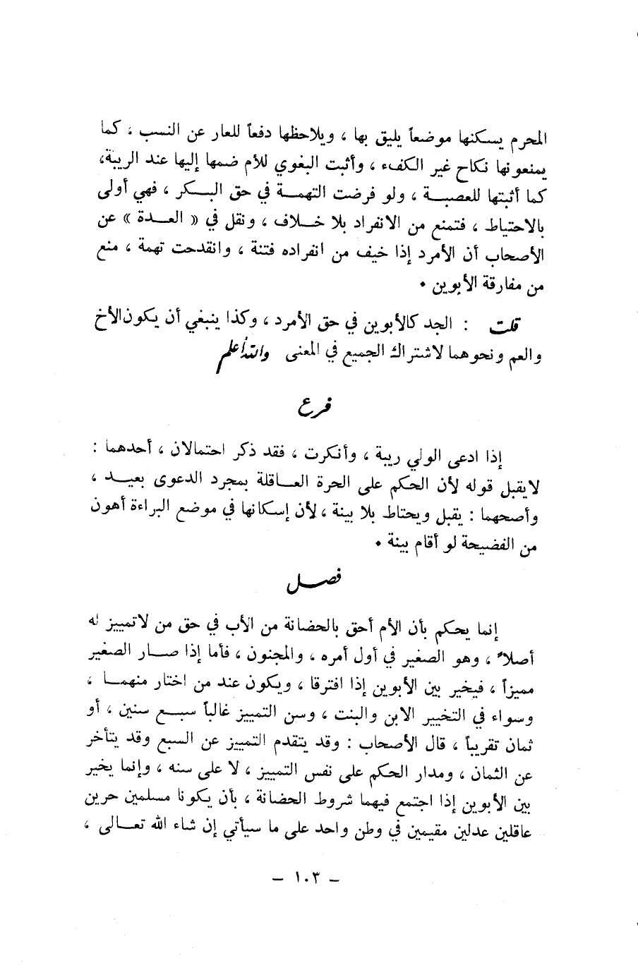 إِنَّمَا يُحْكَمُ بِأَنَّ الْأُمَّ أَحَقُّ بِالْحَضَانَةِ مِنَ الْأَبِ فِي حَقِّ مَنْ لَا تَمْيِيزَ لَهُ أَصْلًا، وَهُوَ الصَّغِيرُ فِي أَوَّلِ أَمْرِهِ، وَالْمَجْنُونُ، فَأَمَّا إِذَا صَارَ الصَّغِيرُ مُمَيِّزًا، فَيُخَيَّرُ بَيْنَ الْأَبَوَيْنِ إِذَا افْتَرَقَا، وَيَكُونُ عِنْدَ مَنِ اخْتَارَ مِنْهُمَا، وَسَوَاءٌ فِي التَّخْيِيرِ الِابْنُ وَالْبِنْتُ، وَسِنُّ التَّمْيِيزِ غَالِبًا سَبْعُ سِنِينَ، أَوْ ثَمَانٍ تَقْرِيبًا، قَالَ الْأَصْحَابُ: وَقَدْ يَتَقَدَّمُ التَّمْيِيزُ عَنِ السَّبْعِ وَقَدْ يَتَأَخَّرُ عَنِ الثَّمَانِ، وَمَدَارُ الْحُكْمِ عَلَى نَفْسِ التَّمْيِيزِ، لَا عَلَى سِنِّهِ، وَإِنَّمَا يُخَيَّرُ بَيْنَ الْأَبَوَيْنِ إِذَا اجْتَمَعَ فِيهِمَا شُرُوطُ الْحَضَانَةِ، بِأَنْ يَكُونَا مُسْلِمَيْنِ حُرَّيْنِ عَاقِلَيْنِ عَدْلَيْنِ مُقِيمَيْنِ فِي وَطَنٍ وَاحِدٍ عَلَى مَا سَيَأْتِي - إِنْ شَاءَ اللَّهُ تَعَالَى -،