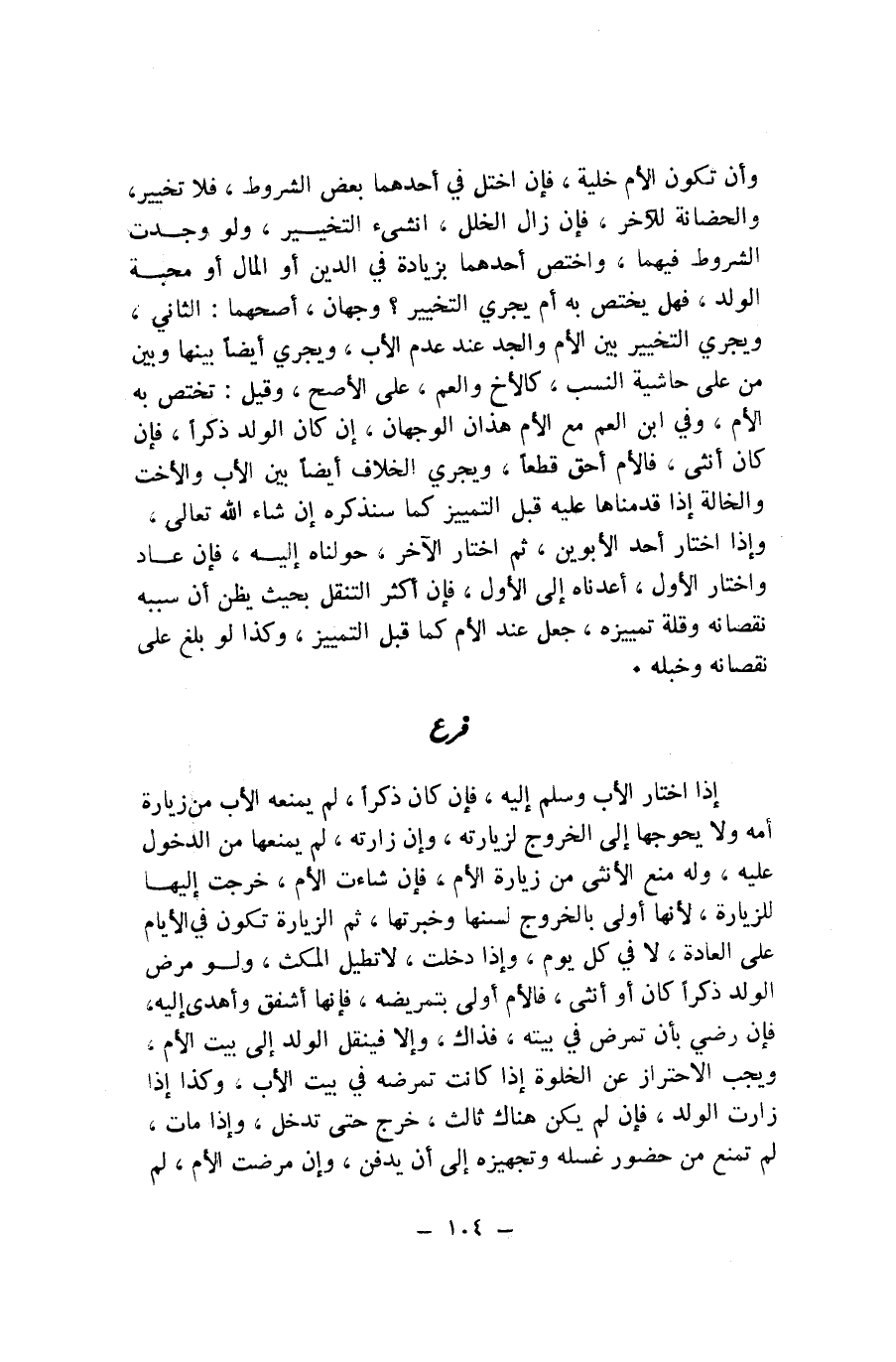 وَأَنْ تَكُونَ الْأُمُّ خَلِيَّةً، فَإِنِ اخْتَلَّ فِي أَحَدِهِمَا بَعْضُ الشُّرُوطِ، فَلَا تَخْيِيرَ، وَالْحَضَانَةُ لِلْآخَرِ، فَإِنْ زَالَ الْخَلَلُ، أُنْشِئَ التَّخْيِيرُ، وَلَوْ وُجِدَتِ الشُّرُوطُ فِيهِمَا، وَاخْتُصَّ أَحَدُهُمَا بِزِيَادَةٍ فِي الدِّينِ أَوِ الْمَالِ أَوْ مَحَبَّةِ الْوَلَدِ، فَهَلْ يَخْتَصُّ بِهِ أَمْ يَجْرِي التَّخْيِيرُ؟ وَجْهَانِ: أَصَحُّهُمَا: الثَّانِي، وَيَجْرِي التَّخْيِيرُ بَيْنَ الْأُمِّ وَالْجَدِّ عِنْدَ عَدَمِ الْأَبِ، وَيَجْرِي أَيْضًا بَيْنَهَا وَبَيْنَ مَنْ عَلَى حَاشِيَةِ النَّسَبِ، كَالْأَخِ وَالْعَمِّ، عَلَى الْأَصَحِّ، وَقِيلَ: تَخْتَصُّ بِهِ الْأُمُّ، وَفِي ابْنِ الْعَمِّ مَعَ الْأُمِّ هَذَانِ الْوَجْهَانِ، إِنْ كَانَ الْوَلَدُ ذَكَرًا، فَإِنْ كَانَ أُنْثَى، فَالْأُمُّ أَحَقُّ قَطْعًا، وَيَجْرِي الْخِلَافُ أَيْضًا بَيْنَ الْأَبِ وَالْأُخْتِ وَالْخَالَةِ إِذَا قَدَّمْنَاهَا عَلَيْهِ قَبْلَ التَّمْيِيزِ كَمَا سَنَذْكُرُهُ - إِنْ شَاءَ اللَّهُ تَعَالَى -، وَإِذَا اخْتَارَ أَحَدَ الْأَبَوَيْنِ، ثُمَّ اخْتَارَ الْآخَرَ، حَوَّلْنَاهُ إِلَيْهِ، فَإِنْ عَادَ وَاخْتَارَ الْأَوَّلَ، أَعَدْنَاهُ إِلَى الْأَوَّلِ، فَإِنْ أَكْثَرَ التَّنَقُّلَ بِحَيْثُ يُظَنُّ أَنَّ سَبَبَهُ نُقْصَانُهُ وَقِلَّةُ تَمْيِيزِهِ، جُعِلَ عِنْدَ الْأُمِّ كَمَا قَبْلَ التَّمْيِيزِ، وَكَذَا لَوْ بَلَغَ عَلَى نُقْصَانِهِ وَخَبَلِهِ.