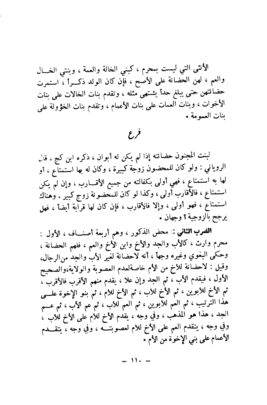 الضَّرْبُ الثَّانِي: مَحْضُ الذُّكُورِ، وَهُمْ أَرْبَعَةُ أَصْنَافٍ: الْأَوَّلُ: مَحْرَمٌ وَارِثٌ، كَالْأَبِ وَالْجَدِّ وَالْأَخِ وَابْنِ الْأَخِ وَالْعَمِّ، فَلَهُمُ الْحَضَانَةُ، وَحَكَى الْبَغَوِيُّ وَغَيْرُهُ وَجْهًا، أَنَّهُ لَا حَضَانَةَ لِغَيْرِ الْأَبِ وَالْجَدِّ مِنَ الرِّجَالِ، وَقِيلَ: لَا حَضَانَةَ لِلْأَخِ مِنَ الْأُمِّ خَاصَّةً لِعَدَمِ الْعُصُوبَةِ وَالْوِلَايَةِ، وَالصَّحِيحُ الْأَوَّلُ، فَيُقَدَّمُ الْأَبُ، ثُمَّ الْجَدُّ وَإِنْ عَلَا، يُقَدَّمُ مِنْهُمُ الْأَقْرَبُ فَالْأَقْرَبُ، ثُمَّ الْأَخُ لِلْأَبَوَيْنِ، ثُمَّ الْأَخُ لِلْأَبِ، ثُمَّ الْأَخُ لِلْأُمِّ، ثُمَّ بَنُو الْإِخْوَةِ عَلَى هَذَا التَّرْتِيبِ، ثُمَّ الْعَمُّ لِلْأَبَوَيْنِ، ثُمَّ الْعَمُّ لِلْأَبِ، ثُمَّ عَمُّ الْأَبِ، ثُمَّ عَمُّ الْجَدِّ، هَذَا هُوَ الْمَذْهَبُ، وَفِي وَجْهٍ يُقَدَّمُ الْأَخُ لِلْأُمِّ عَلَى الْأَخِ لِلْأَبِ، وَفِي وَجْهٍ يَتَقَدَّمُ الْعَمُّ عَلَى الْأَخِ لِلْأُمِّ لِعُصُوبَتِهِ، وَفِي وَجْهٍ، يَتَقَدَّمُ الْأَعْمَامُ عَلَى بَنِي الْإِخْوَةِ مِنَ الْأُمِّ.
