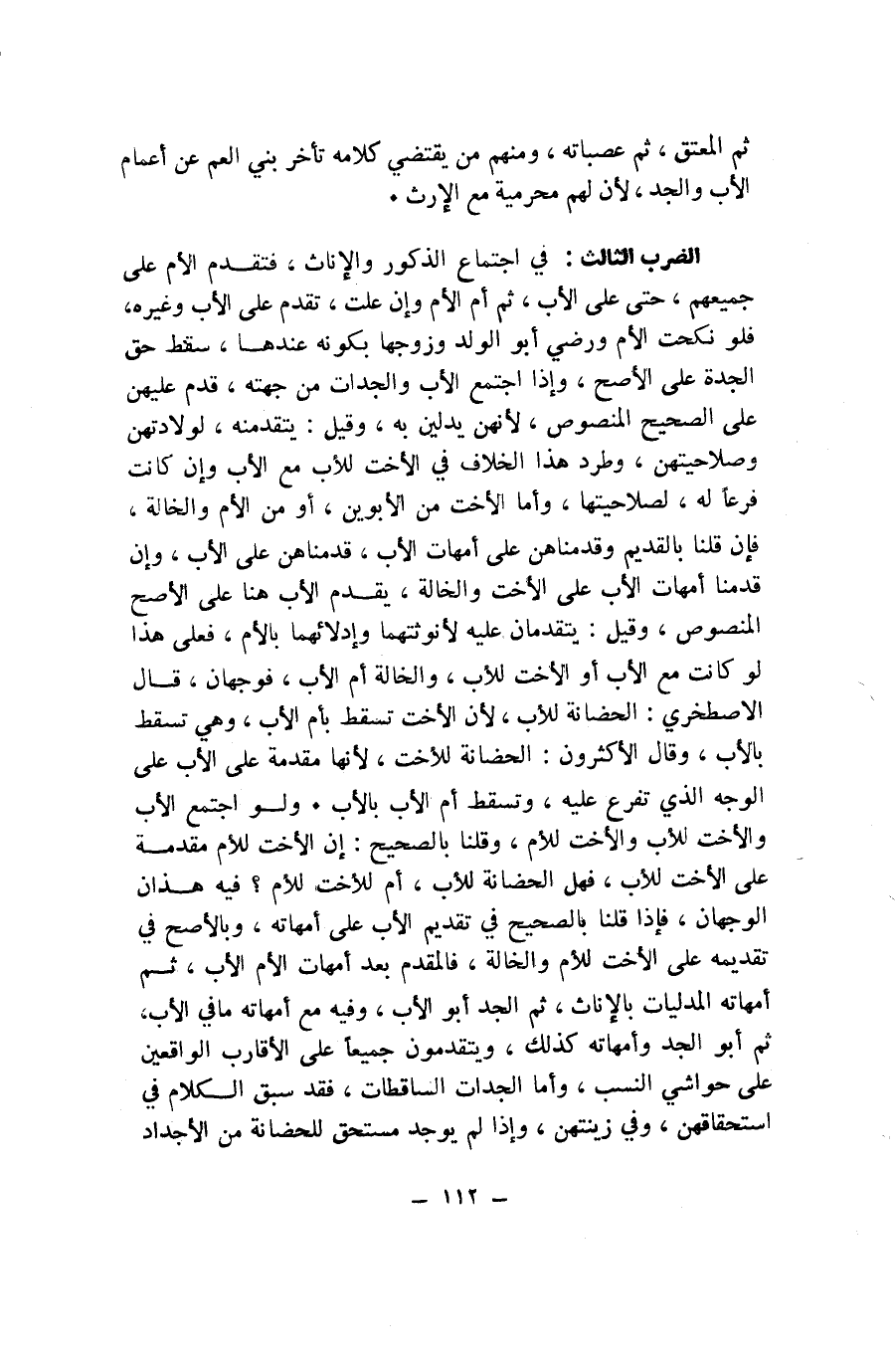 الضَّرْبُ الثَّالِثُ: فِي اجْتِمَاعِ الذُّكُورِ وَالْإِنَاثِ، فَتُقَدَّمُ الْأُمُّ عَلَى جَمِيعِهِمْ، حَتَّى عَلَى الْأَبِ، ثُمَّ أُمُّ الْأُمِّ وَإِنْ عَلَتْ، تُقَدَّمُ عَلَى الْأَبِ وَغَيْرِهِ، فَلَوْ نَكَحَتِ الْأُمُّ وَرَضِيَ أَبُو الْوَلَدِ وَزَوْجُهَا بِكَوْنِهِ عِنْدَهَا، سَقَطَ حَقُّ الْجَدَّةِ عَلَى الْأَصَحِّ، وَإِذَا اجْتَمَعَ الْأَبُ وَالْجَدَّاتُ مِنْ جِهَتِهِ، قُدِّمَ عَلَيْهِنَّ عَلَى الصَّحِيحِ الْمَنْصُوصِ، لِأَنَّهُنَّ يُدْلِينَ بِهِ، وَقِيلَ: يَتَقَدَّمْنَهُ لِوِلَادَتِهِنَّ وَصَلَاحِيَتِهِنَّ، وَطُرِدَ هَذَا الْخِلَافُ فِي الْأُخْتِ لِلْأَبِ مَعَ الْأَبِ وَإِنْ كَانَتْ فَرْعًا لَهُ، لِصَلَاحِيَتِهَا، وَأَمَّا الْأُخْتُ مِنَ الْأَبَوَيْنِ، أَوْ مِنَ الْأُمِّ وَالْخَالَةِ، فَإِنْ قُلْنَا بِالْقَدِيمِ وَقَدَّمْنَاهُنَّ عَلَى أُمَّهَاتِ الْأَبِ، قَدَّمْنَاهُنَّ عَلَى الْأَبِ، وَإِنْ قَدَّمْنَا أُمَّهَاتِ الْأَبِ عَلَى الْأُخْتِ وَالْخَالَةِ، يُقَدَّمُ الْأَبُ هُنَا عَلَى الْأَصَحِّ الْمَنْصُوصِ، وَقِيلَ: يَتَقَدَّمَانِ عَلَيْهِ لِأُنُوثَتِهِمَا وَإِدْلَائِهِمَا بِالْأُمِّ، فَعَلَى هَذَا لَوْ كَانَتْ مَعَ الْأَبِ أَوِ الْأُخْتِ لِلْأَبِ وَالْخَالَةِ أُمُّ الْأَبِ، فَوَجْهَانِ، قَالَ الْإِصْطَخْرِيُّ: الْحَضَانَةُ لِلْأَبِ، لِأَنَّ الْأُخْتَ تَسْقُطُ بِأُمِّ الْأَبِ، وَهِيَ تَسْقُطُ بِالْأَبِ، وَقَالَ الْأَكْثَرُونَ: الْحَضَانَةُ لِلْأُخْتِ، لِأَنَّهَا مُقَدَّمَةٌ عَلَى الْأَبِ عَلَى الْوَجْهِ الَّذِي تُفَرَّعُ عَلَيْهِ، وَتَسْقُطُ أُمُّ الْأَبِ بِالْأَبِ. وَلَوِ اجْتَمَعَ الْأَبُ وَالْأُخْتُ لِلْأَبِ وَالْأُخْتُ لِلْأُمِّ، وَقُلْنَا بِالصَّحِيحِ: إِنَّ الْأُخْتَ لِلْأُمِّ مُقَدَّمَةٌ عَلَى الْأُخْتِ لِلْأَبِ، فَهَلِ الْحَضَانَةُ لِلْأَبِ، أَمْ لِلْأُخْتِ لِلْأُمِّ؟ فِيهِ هَذَانِ الْوَجْهَانِ، فَإِذَا قُلْنَا بِالصَّحِيحِ فِي تَقْدِيمِ الْأَبِ عَلَى أُمَّهَاتِهِ، وَبِالْأَصَحِّ فِي تَقْدِيمِهِ عَلَى الْأُخْتِ لِلْأُمِّ وَالْخَالَةِ، فَالْمُقَدَّمُ بَعْدَ أُمَّهَاتِ الْأُمِّ الْأَبُ، ثُمَّ أُمَّهَاتُهُ الْمُدْلِيَاتُ بِالْإِنَاثِ، ثُمَّ الْجَدُّ أَبُو الْأَبِ، وَفِيهِ مَعَ أُمَّهَاتِهِ مَا فِي الْأَبِ، ثُمَّ أَبُو الْجَدِّ وَأُمَّهَاتُهُ كَذَلِكَ، وَيَتَقَدَّمُونَ جَمِيعًا عَلَى الْأَقَارِبِ الْوَاقِعِينَ عَلَى حَوَاشِي النَّسَبِ، وَأَمَّا الْجَدَّاتُ السَّاقِطَاتُ، فَقَدْ سَبَقَ الْكَلَامُ فِي اسْتِحْقَاقِهِنَّ، وَفِي زِينَتِهِنَّ، وَإِذَا لَمْ يُوجَدْ مُسْتَحِقٌّ لِلْحَضَانَةِ مِنَ الْأَجْدَادِ