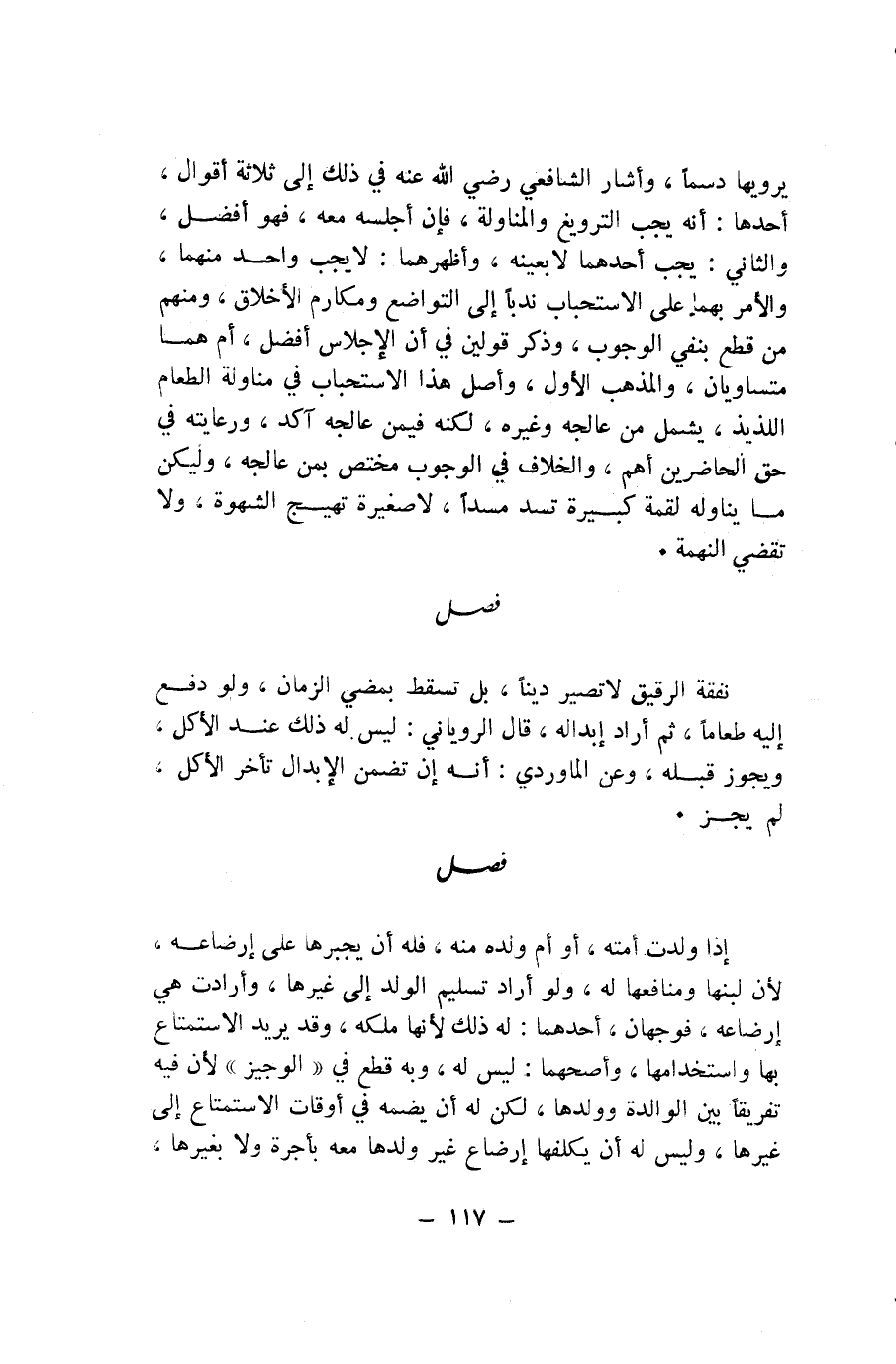 يَرْوِيَهَا دَسَمًا، وَأَشَارَ الشَّافِعِيُّ - رَضِيَ اللَّهُ عَنْهُ - فِي ذَلِكَ إِلَى ثَلَاثَةِ أَقْوَالٍ: أَحَدُهَا: أَنَّهُ يَجِبُ التَّرْوِيغُ وَالْمُنَاوَلَةُ، فَإِنْ أَجْلَسَهُ مَعَهُ، فَهُوَ أَفْضَلُ، وَالثَّانِي: يَجِبُ أَحَدُهُمَا لَا بِعَيْنِهِ، وَأَظْهَرُهُمَا: لَا يَجِبُ وَاحِدٌ مِنْهُمَا، وَالْأَمْرُ بِهِمَا عَلَى الِاسْتِحْبَابِ نَدْبًا إِلَى التَّوَاضُعِ وَمَكَارِمِ الْأَخْلَاقِ، وَمِنْهُمْ مَنْ قَطَعَ بِنَفْيِ الْوُجُوبِ وَذَكَرَ قَوْلَيْنِ فِي أَنَّ الْإِجْلَاسَ أَفْضَلُ، أَمْ هُمَا مُتَسَاوِيَانِ، وَالْمَذْهَبُ الْأَوَّلُ، وَأَصْلُ هَذَا الِاسْتِحْبَابُ فِي مُنَاوَلَةِ الطَّعَامِ اللَّذِيذِ، يَشْمَلُ مَنْ عَالَجَهُ وَغَيْرَهُ، لَكِنَّهُ فِيمَنْ عَالَجَهُ آكَدُ، وَرِعَايَتُهُ فِي حَقِّ الْحَاضِرِينَ أَهَمُّ، وَالْخِلَافُ فِي الْوُجُوبِ مُخْتَصٌّ بِمَنْ عَالَجَهُ، وَلْيَكُنْ مَا يُنَاوِلُهُ لُقْمَةً كَبِيرَةً تَسُدُّ مَسَدًّا، لَا صَغِيرَةً تُهَيِّجُ الشَّهْوَةَ، وَلَا تَقْضِي النَّهْمَةَ.