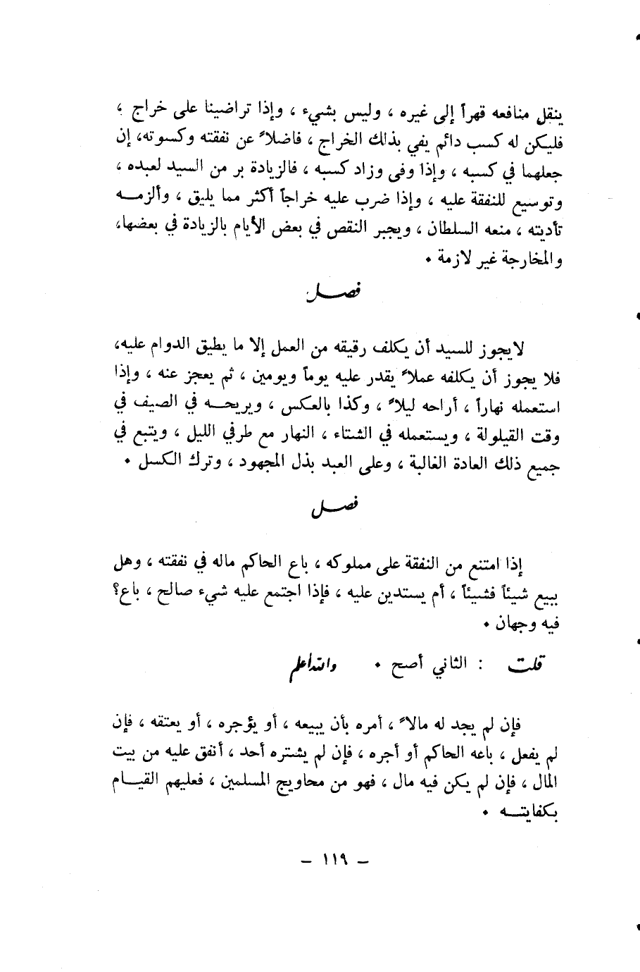 يَنْقُلُ مَنَافِعَهُ قَهْرًا إِلَى غَيْرِهِ، وَلَيْسَ بِشَيْءٍ، وَإِذَا تَرَاضَيْنَا عَلَى خَرَاجٍ، فَلْيَكُنْ لَهُ كَسْبٌ دَائِمٌ يَفِي بِذَلِكَ الْخَرَاجِ، فَاضِلًا عَنْ نَفَقَتِهِ وَكِسْوَتِهِ، إِنْ جَعَلَهُمَا فِي كَسْبِهِ، وَإِذَا وَفَّى وَزَادَ كَسْبُهُ، فَالزِّيَادَةُ بِرٌّ مِنَ السَّيِّدِ لِعَبْدِهِ، وَتَوْسِيعٌ لِلنَّفَقَةِ عَلَيْهِ، وَإِذَا ضَرَبَ عَلَيْهِ خَرَاجًا أَكْثَرَ مِمَّا يَلِيقُ، وَأَلْزَمَهُ تَأْدِيَتَهُ، مَنَعَهُ السُّلْطَانُ، وَيُجْبَرُ النَّقْصُ فِي بَعْضِ الْأَيَّامِ بِالزِّيَادَةِ فِي بَعْضِهَا، وَالْمُخَارَجَةُ غَيْرُ لَازِمَةٍ.