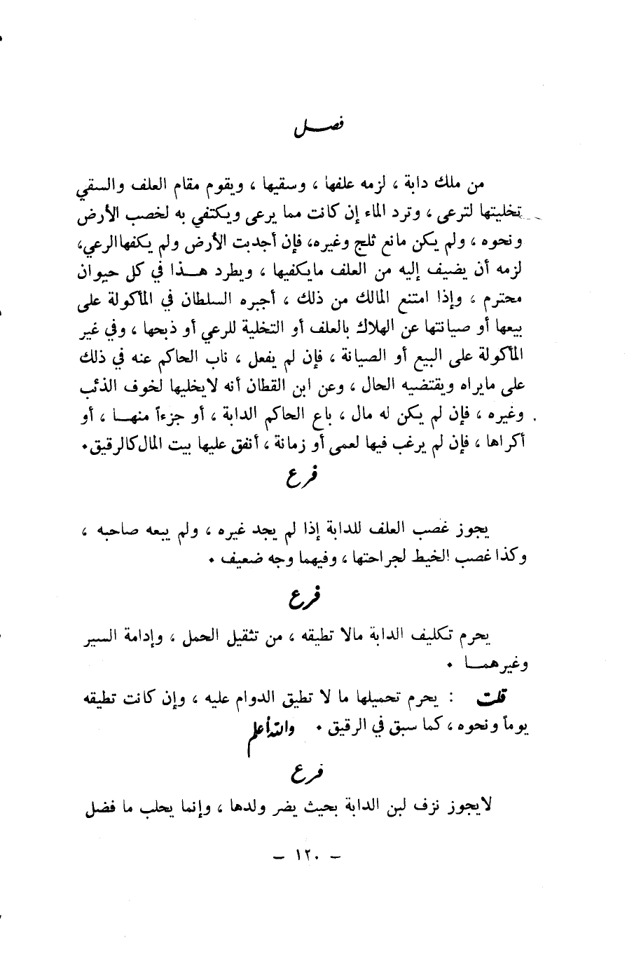 مَنْ مَلَكَ دَابَّةً، لَزِمَهُ عَلْفُهَا، وَسَقْيُهَا، وَيَقُومُ مَقَامَ الْعَلْفِ وَالسَّقْيِ تَخْلِيَتُهَا لِتَرْعَى، وَتَرِدَ الْمَاءَ إِنْ كَانَتْ مِمَّا يَرْعَى وَيَكْتَفِي بِهِ، لِخِصْبِ الْأَرْضِ وَنَحْوِهِ، وَلَمْ يَكُنْ مَانِعُ ثَلْجٍ وَغَيْرِهِ، فَإِنْ أَجْدَبَتِ الْأَرْضُ وَلَمْ يَكْفِهَا الرَّعْيُ، لَزِمَهُ أَنْ يُضِيفَ إِلَيْهِ مِنَ الْعَلَفِ مَا يَكْفِيهَا، وَيَطَّرِدُ هَذَا فِي كُلِّ حَيَوَانٍ مُحْتَرَمٍ، وَإِذَا امْتَنَعَ الْمَالِكُ مِنْ ذَلِكَ، أَجْبَرَهُ السُّلْطَانُ فِي الْمَأْكُولَةِ عَلَى بَيْعِهَا أَوْ صِيَانَتِهَا عَنِ الْهَلَاكِ بِالْعَلْفِ أَوِ التَّخْلِيَةِ لِلرَّعْيِ أَوْ ذَبْحِهَا، وَفِي غَيْرِ الْمَأْكُولَةِ عَلَى الْبَيْعِ أَوِ الصِّيَانَةِ، فَإِنْ لَمْ يَفْعَلْ، نَابَ الْحَاكِمُ عَنْهُ فِي ذَلِكَ عَلَى مَا يَرَاهُ وَيَقْتَضِيهِ الْحَالُ، وَعَنِ ابْنِ الْقَطَّانِ أَنَّهُ لَا يُخَلِّيهَا لِخَوْفِ الذِّئْبِ وَغَيْرِهِ، فَإِنْ لَمْ يَكُنْ لَهُ مَالٌ، بَاعَ الْحَاكِمُ الدَّابَّةَ، أَوْ جُزْءًا مِنْهَا، أَوْ أَكْرَاهَا، فَإِنْ لَمْ يَرْغَبْ فِيهَا لِعَمًى أَوْ زَمَانَةٍ، أَنْفَقَ عَلَيْهَا بَيْتُ الْمَالِ كَالرَّقِيقِ.