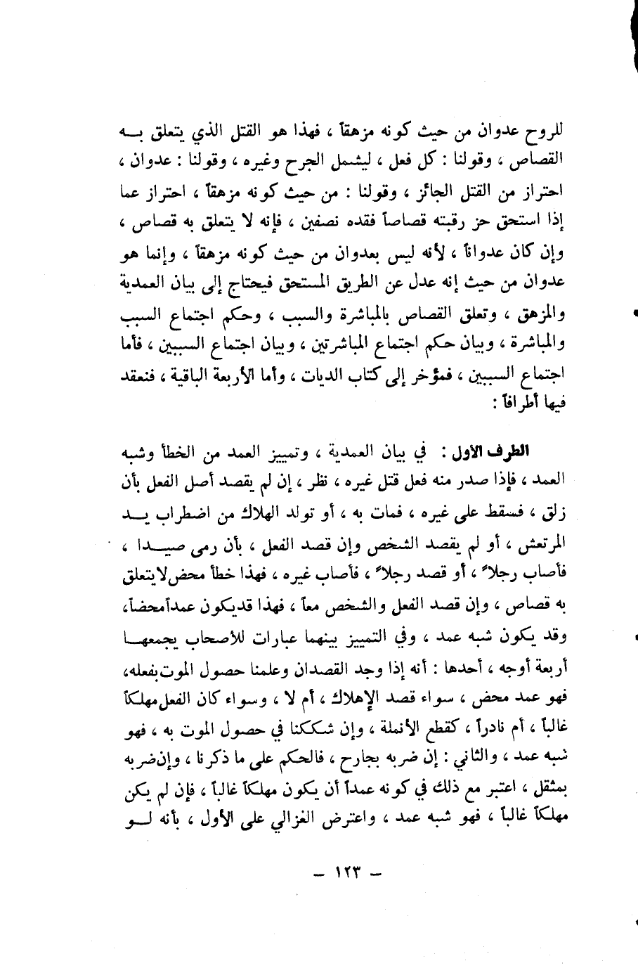 لِلرُّوحِ عُدْوَانٍ مِنْ حَيْثُ كَوْنُهُ مُزْهِقًا، فَهَذَا هُوَ الْقَتْلُ الَّذِي يَتَعَلَّقُ بِهِ الْقِصَاصُ، وَقَوْلُنَا: كُلُّ فِعْلٍ، لِيَشْمَلَ الْجُرْحَ وَغَيْرَهُ، وَقَوْلُنَا: عُدْوَانٍ، احْتِرَازٌ مِنَ الْقَتْلِ الْجَائِزِ، وَقَوْلُنَا: مِنْ حَيْثُ كَوْنُهُ مُزْهِقًا، احْتِرَازٌ عَمَّا إِذَا اسْتَحَقَّ حَزَّ رَقَبَتِهِ قِصَاصًا فَقَدَّهُ نِصْفَيْنِ، فَإِنَّهُ لَا يَتَعَلَّقُ بِهِ قِصَاصٌ، وَإِنْ كَانَ عُدْوَانًا، لِأَنَّهُ لَيْسَ بِعُدْوَانٍ مِنْ حَيْثُ كَوْنُهُ مُزْهِقًا، وَإِنَّمَا هُوَ عُدْوَانٌ مِنْ حَيْثُ إِنَّهُ عَدْلٌ عَنِ الطَّرِيقِ الْمُسْتَحِقِّ فَيَحْتَاجُ إِلَى بَيَانِ الْعَمْدِيَّةِ وَالْمُزْهِقِ وَتَعَلُّقِ الْقِصَاصِ بِالْمُبَاشَرَةِ وَالسَّبَبِ، وَحُكْمِ اجْتِمَاعِ السَّبَبِ وَالْمُبَاشَرَةِ، وَبَيَانِ حَكَمِ اجْتِمَاعِ الْمُبَاشَرَتَيْنِ، وَبَيَانِ اجْتِمَاعِ السَّبَبَيْنِ، فَأَمَّا اجْتِمَاعُ السَّبَبَيْنِ، فَمُؤَخَّرٌ إِلَى كِتَابِ الدِّيَاتِ، وَأَمَّا الْأَرْبَعَةُ الْبَاقِيَةُ، فَنَعْقِدُ فِيهَا أَطْرَافًا: