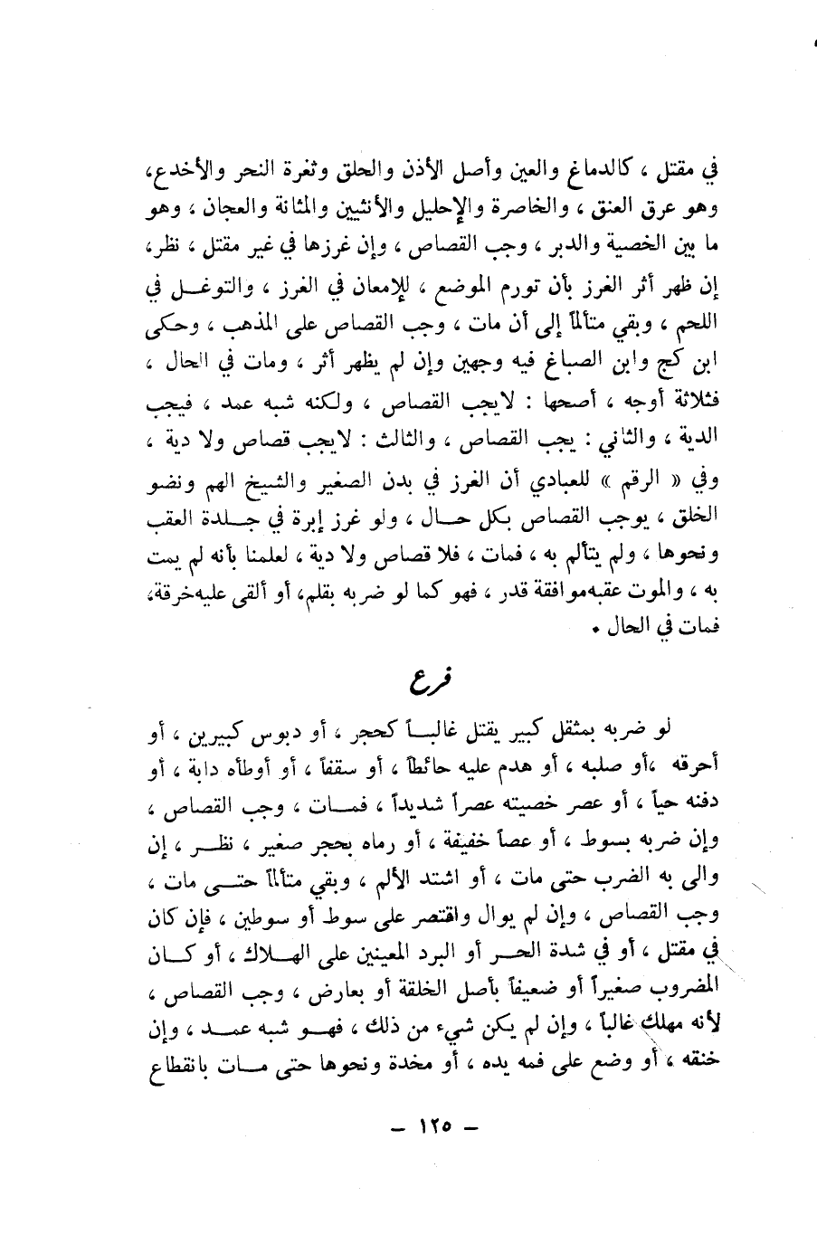 فِي مَقْتَلٍ، كَالدِّمَاغِ وَالْعَيْنِ وَأَصْلِ الْأُذُنِ وَالْحَلْقِ وَثُغْرَةِ النَّحْرِ وَالْأَخْدَعِ، وَهُوَ عِرْقُ الْعُنُقِ، وَالْخَاصِرَةِ وَالْإِحْلِيلِ وَالْأُنْثَيَيْنِ وَالْمَثَانَةِ وَالْعِجَانِ، وَهُوَ مَا بَيْنَ الْخُصْيَةِ وَالدُّبُرِ، وَجَبَ الْقِصَاصُ، وَإِنْ غَرَزَهَا فِي غَيْرِ مَقْتَلٍ، نُظِرَ؛ إِنْ ظَهَرَ أَثَرُ الْغَرْزِ بِأَنْ تَوَرَّمَ الْمَوْضِعُ، لِلْإِمْعَانِ فِي الْغَرْزِ، وَالتَّوَغُّلِ فِي اللَّحْمِ، وَبَقِيَ مُتَأَلِّمًا إِلَى أَنْ مَاتَ، وَجَبَ الْقِصَاصُ عَلَى الْمَذْهَبِ، وَحَكَى ابْنُ كَجٍّ وَابْنُ الصَّبَّاغِ فِيهِ وَجْهَيْنِ وَإِنْ لَمْ يَظْهَرْ أَثَرٌ، وَمَاتَ فِي الْحَالِ، فَثَلَاثَةُ أَوْجُهٍ: أَصَحُّهَا: لَا يَجِبُ الْقِصَاصُ، وَلَكِنَّهُ شِبْهُ عَمْدٍ، فَيَجِبُ الدِّيَةُ، وَالثَّانِي: يَجِبُ الْقِصَاصُ، وَالثَّالِثُ: لَا يَجِبُ قِصَاصٌ وَلَا دِيَةٌ، وَفِي «الرَّقْمِ» لِلْعَبَّادِيِّ أَنَّ الْغَرْزَ فِي بَدَنِ الصَّغِيرِ وَالشَّيْخِ الْهَرِمِ وَنِضْوِ الْخَلْقِ، يُوجِبُ الْقِصَاصَ بِكُلِّ حَالٍ، وَلَوْ غَرَزَ إِبْرَةً فِي جِلْدَةِ الْعَقِبِ وَنَحْوِهَا، وَلَمْ يَتَأَلَّمْ بِهِ، فَمَاتَ، فَلَا قِصَاصَ وَلَا دِيَةَ، لِعِلْمِنَا بِأَنَّهُ لَمْ يَمُتْ بِهِ، وَالْمَوْتُ عَقِبَهُ مُوَافَقَةُ قَدَرٍ، فَهُوَ كَمَا لَوْ ضَرَبَهُ بِقَلَمٍ، أَوْ أَلْقَى عَلَيْهِ خِرْقَةً، فَمَاتَ فِي الْحَالِ.
