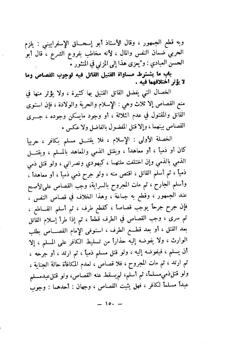 الْخَصْلَةُ الْأُولَى: الْإِسْلَامُ، فَلَا يُقْتَلُ مُسْلِمٌ بِكَافِرٍ، حَرْبِيًّا كَانَ أَوْ ذِمِّيًّا، أَوْ مُعَاهِدًا، وَيُقْتَلُ الذِّمِّيُّ وَالْمُعَاهِدُ بِالْمُسْلِمِ، وَيُقْتَلُ الذِّمِّيُّ بِالذِّمِّيِّ وَإِنِ اخْتَلَفَتْ مِلَّتُهُمَا، كَيَهُودِيٍّ وَنَصْرَانِيٍّ، وَلَوْ قَتَلَ ذِمِّيٌّ ذِمِّيًّا، ثُمَّ أَسْلَمَ الْقَاتِلُ اقْتُصَّ مِنْهُ، وَلَوْ جَرَحَ ذِمِّيٌّ ذِمِّيًّا، أَوْ مُعَاهِدًا، وَأَسْلَمَ الْجَارِحُ، ثُمَّ مَاتَ الْمَجْرُوحُ بِالسِّرَايَةِ، وَجَبَ الْقِصَاصُ عَلَى الْأَصَحِّ عِنْدَ الْجُمْهُورِ، وَقَطَعَ بِهِ جَمَاعَةٌ، وَهَذَا الْخِلَافُ فِي قِصَاصِ النَّفْسِ.