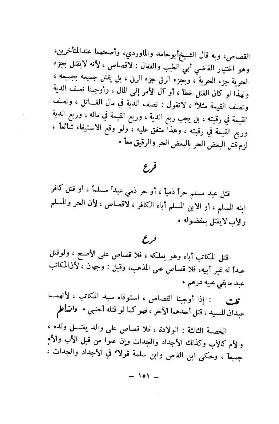 قَتَلَ عَبْدٌ مُسْلِمٌ حُرًّا ذِمِّيًّا، أَوْ حُرٌّ ذِمِّيٌّ عَبْدًا مُسْلِمًا، أَوْ قَتَلَ كَافِرٌ ابْنَهُ الْمُسْلِمَ، أَوِ الِابْنُ الْمُسْلِمُ أَبَاهُ الْكَافِرَ، لَا قِصَاصَ، لِأَنَّ الْحُرَّ وَالْمُسْلِمَ وَالْأَبَ لَا يُقْتَلُ بِمَفْضُولِهِ.
