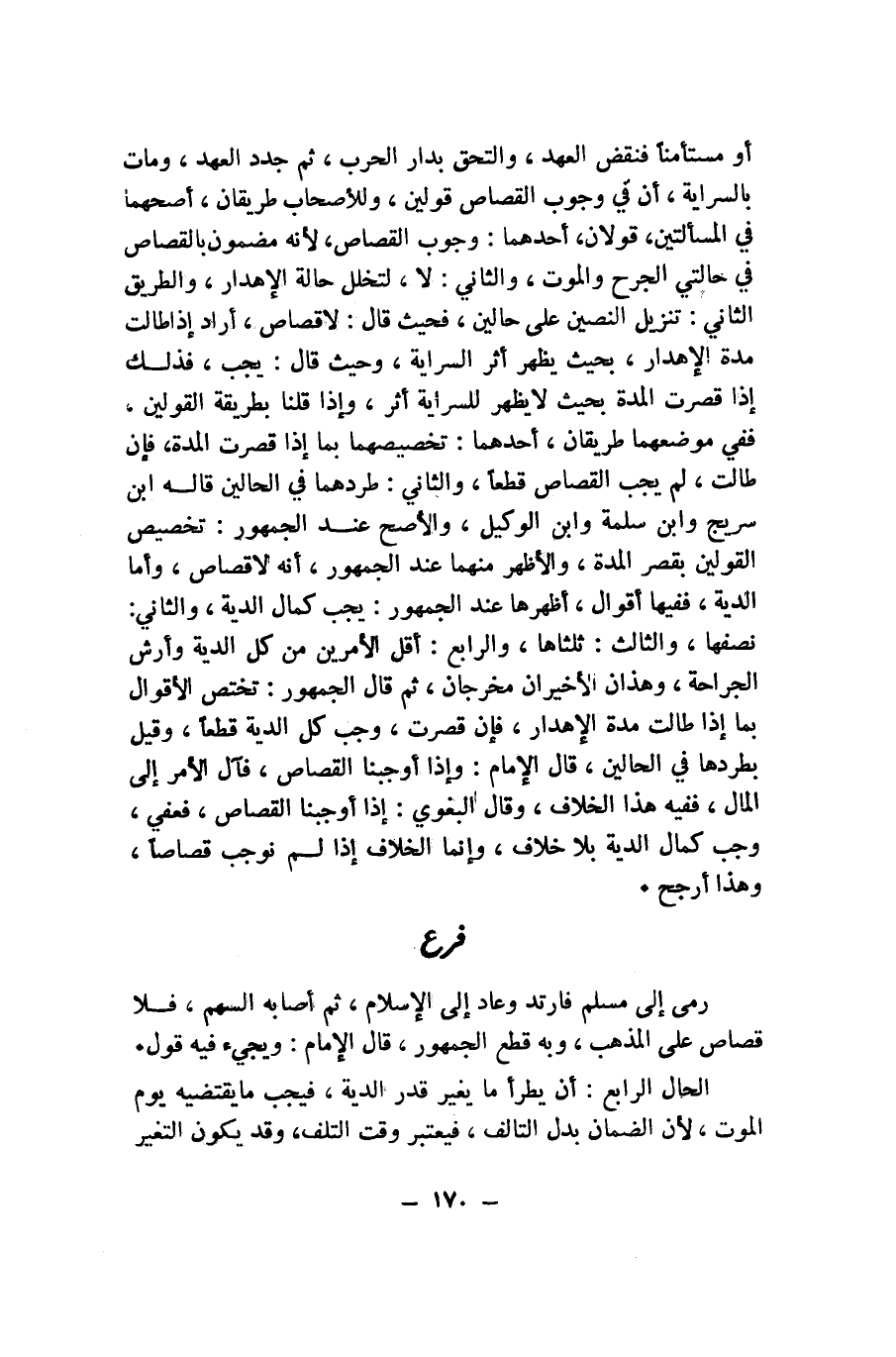 رَمَى إِلَى مُسْلِمٍ فَارْتَدَّ وَعَادَ إِلَى الْإِسْلَامِ، ثُمَّ أَصَابَهُ السَّهْمُ، فَلَا قِصَاصَ عَلَى الْمَذْهَبِ، وَبِهِ قَطَعَ الْجُمْهُورُ.