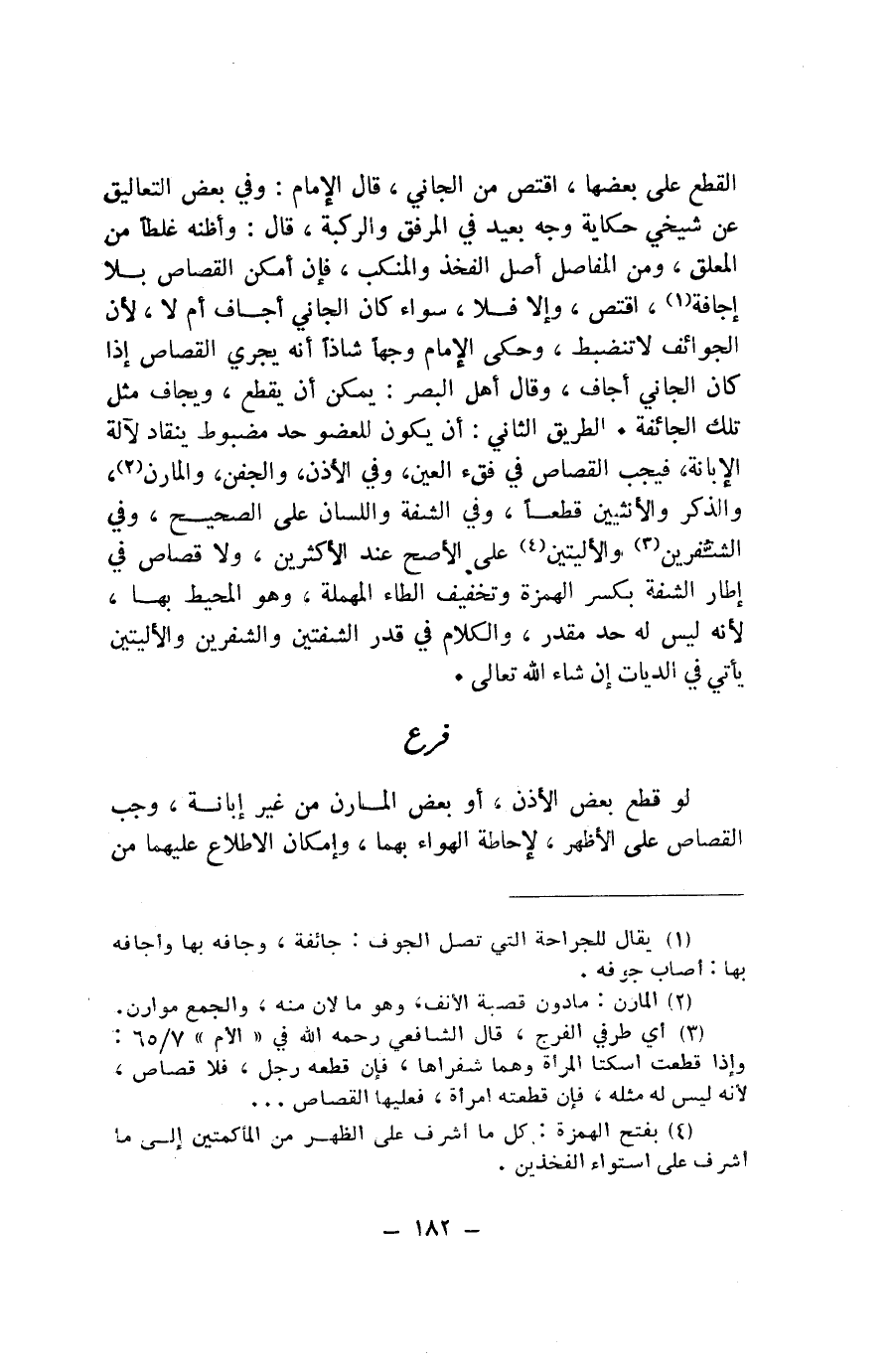 قَالَ الْإِمَامُ: وَفِي بَعْضِ التَّعَالِيقِ عَنْ شَيْخِي حِكَايَةُ وَجْهٍ بَعِيدٍ فِي الْمِرْفَقِ وَالرُّكْبَةِ، قَالَ: وَأَظُنُّهُ غَلَطًا مِنَ الْمُعَلِّقِ، وَمِنَ الْمَفَاصِلِ أَصْلُ الْفَخِذِ وَالْمَنْكِبِ، فَإِنْ أَمْكَنَ الْقِصَاصُ بِلَا إِجَافَةٍ، اقْتَصَّ، وَإِلَّا فَلَا، سَوَاءٌ كَانَ الْجَانِي أَجَافَ أَمْ لَا، لِأَنَّ الْجَوَائِفَ لَا تَنْضَبِطُ.