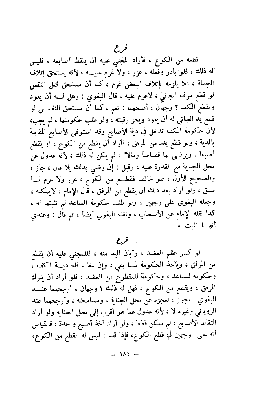 قَالَ الْبَغَوِيُّ: وَهَلْ لَهُ أَنْ يَعُودَ وَيَقْطَعَ الْكَفَّ؟ وَجْهَانِ، أَصَحُّهُمَا: نَعَمْ، كَمَا أَنَّ مُسْتَحِقَّ النَّفْسِ لَوْ قَطَعَ يَدَ الْجَانِي لَهُ أَنْ يَعُودَ وَيَحُزَّ رَقَبَتَهُ، وَلَوْ طَلَبَ حُكُومَتَهَا، لَمْ يُجَبْ، لِأَنَّ الْكَفَّ تَدْخُلُ فِي دِيَةِ الْأَصَابِعِ وَقَدِ اسْتَوْفَى الْأَصَابِعَ الْمُقَابِلَةَ بِالدِّيَةِ، وَلَوْ قَطَعَ يَدَهُ مِنَ الْمِرْفَقِ، فَأَرَادَ أَنْ يَقْطَعَ مِنَ الْكُوعِ، أَوْ يَقْطَعَ أُصْبُعًا، وَيَرْضَى بِهَا قِصَاصًا وَمَالًا، لَمْ يَكُنْ لَهُ ذَلِكَ، لِأَنَّهُ عُدُولٌ عَنْ مَحَلِّ الْجِنَايَةِ مَعَ الْقُدْرَةِ عَلَيْهِ.