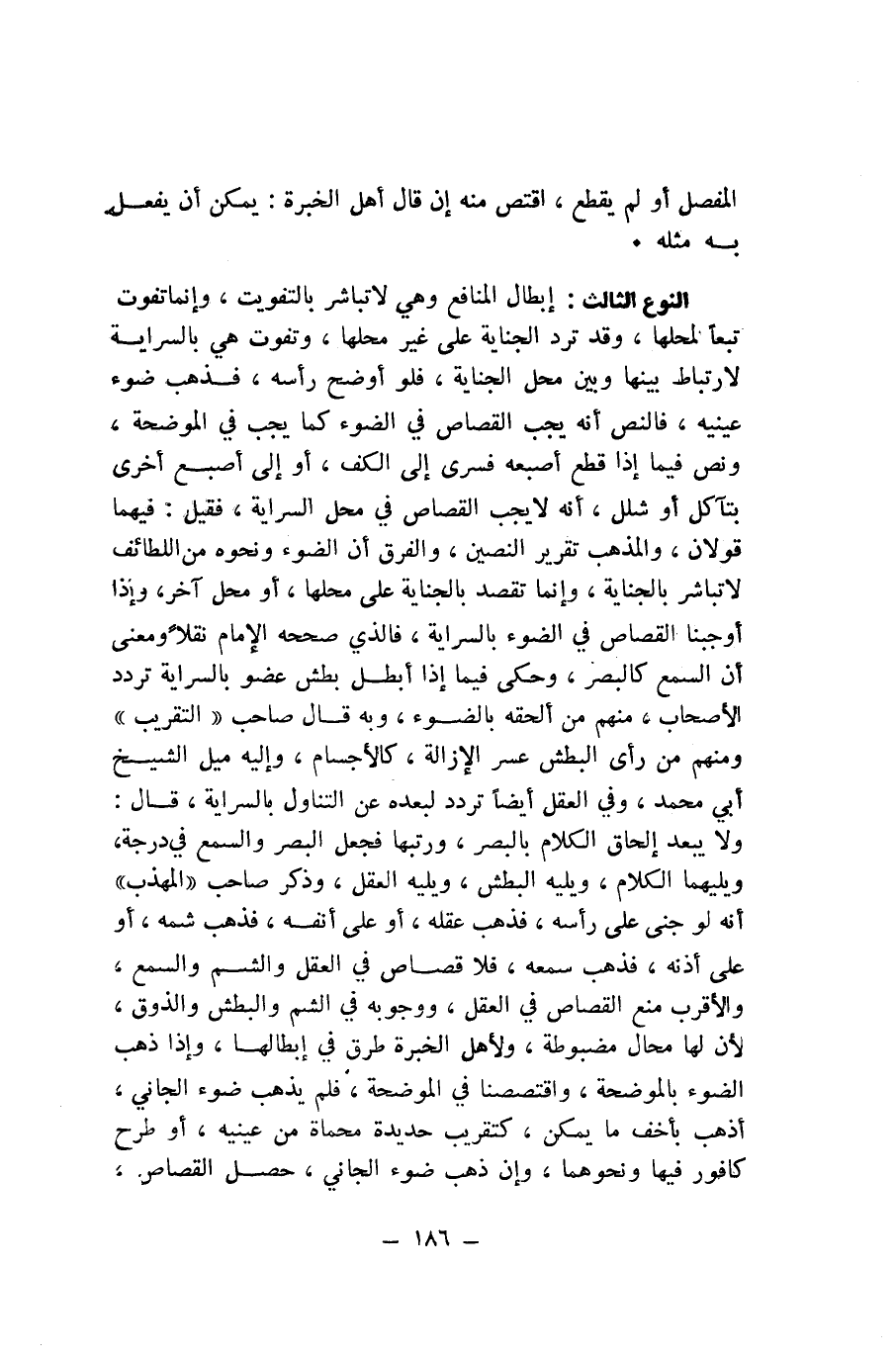 النَّوْعُ الثَّالِثُ: إِبْطَالُ الْمَنَافِعِ وَهِيَ لَا تُبَاشَرُ بِالتَّفْوِيتِ، وَإِنَّمَا تُفَوَّتُ تَبَعًا لِمَحَلِّهَا، وَقَدْ تَرِدُ الْجِنَايَةُ عَلَى غَيْرِ مَحَلِّهَا، وَتَفُوتُ هِيَ بِالسِّرَايَةِ لِارْتِبَاطٍ بَيْنَهَا وَبَيْنَ مَحَلِّ الْجِنَايَةِ، فَلَوْ أَوْضَحَ رَأْسَهُ، فَذَهَبَ ضَوْءُ عَيْنَيْهِ، فَالنَّصُّ أَنَّهُ يَجِبُ الْقِصَاصُ فِي الضَّوْءِ كَمَا يَجِبُ فِي الْمُوضِحَةِ، وَنَصَّ فِيمَا إِذَا قَطَعَ أُصْبُعَهُ فَسَرَى إِلَى الْكَفِّ، أَوْ إِلَى أُصْبُعٍ أُخْرَى بِتَآكُلٍ أَوْ شَلَلٍ، أَنَّهُ لَا يَجِبُ الْقِصَاصَ فِي مَحَلِّ السِّرَايَةِ.