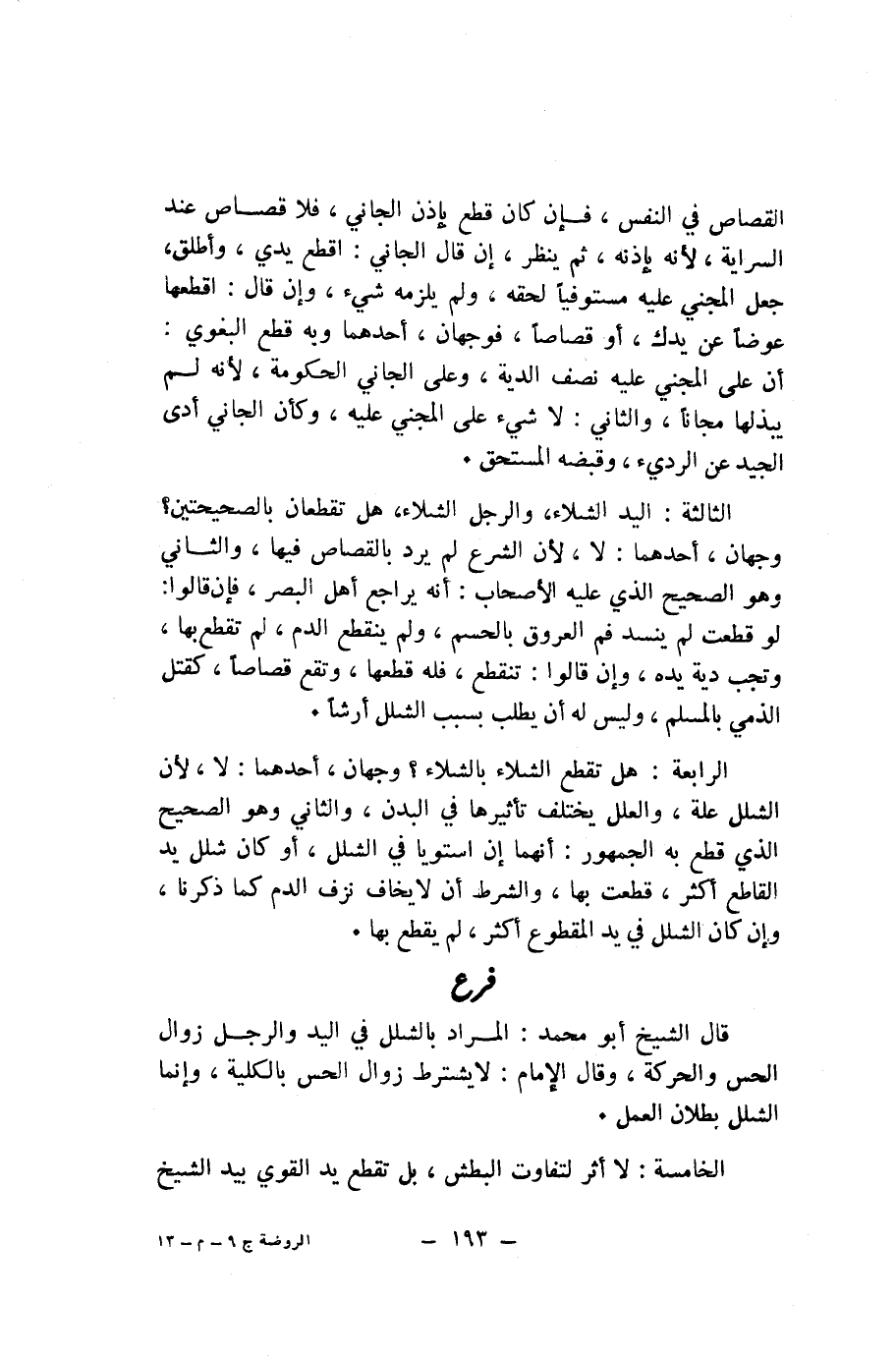 قَالَ الشَّيْخُ أَبُو مُحَمَّدٍ: الْمُرَادُ بِالشَّلَلِ فِي الْيَدِ وَالرَّجْلِ زَوَالُ الْحِسِّ وَالْحَرَكَةِ، وَقَالَ الْإِمَامُ: لَا يُشْتَرَطُ زَوَالُ الْحِسِّ بِالْكُلِّيَّةِ، وَإِنَّمَا الشَّلَلُ بُطْلَانُ الْعَمَلِ.