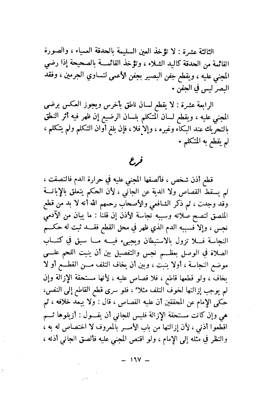 الثَّالِثَةَ عَشْرَةَ: لَا تُؤْخَذُ الْعَيْنُ السَّلِيمَةُ بِالْحَدَقَةِ الْعَمْيَاءِ، وَالصُّورَةُ الْقَائِمَةُ مِنَ الْحَدَقَةِ كَالْيَدِ الشَّلَّاءِ، وَتُؤْخَذُ الْقَائِمَةُ بِالصَّحِيحَةِ إِذَا رَضِيَ الْمَجْنِيُّ عَلَيْهِ، وَيُقْطَعُ جَفْنُ الْبَصِيرِ بِجَفْنِ الْأَعْمَى لِتَسَاوِي الْجِرْمَيْنِ، وَفَقْدُ الْبَصَرِ لَيْسَ فِي الْجَفْنِ.