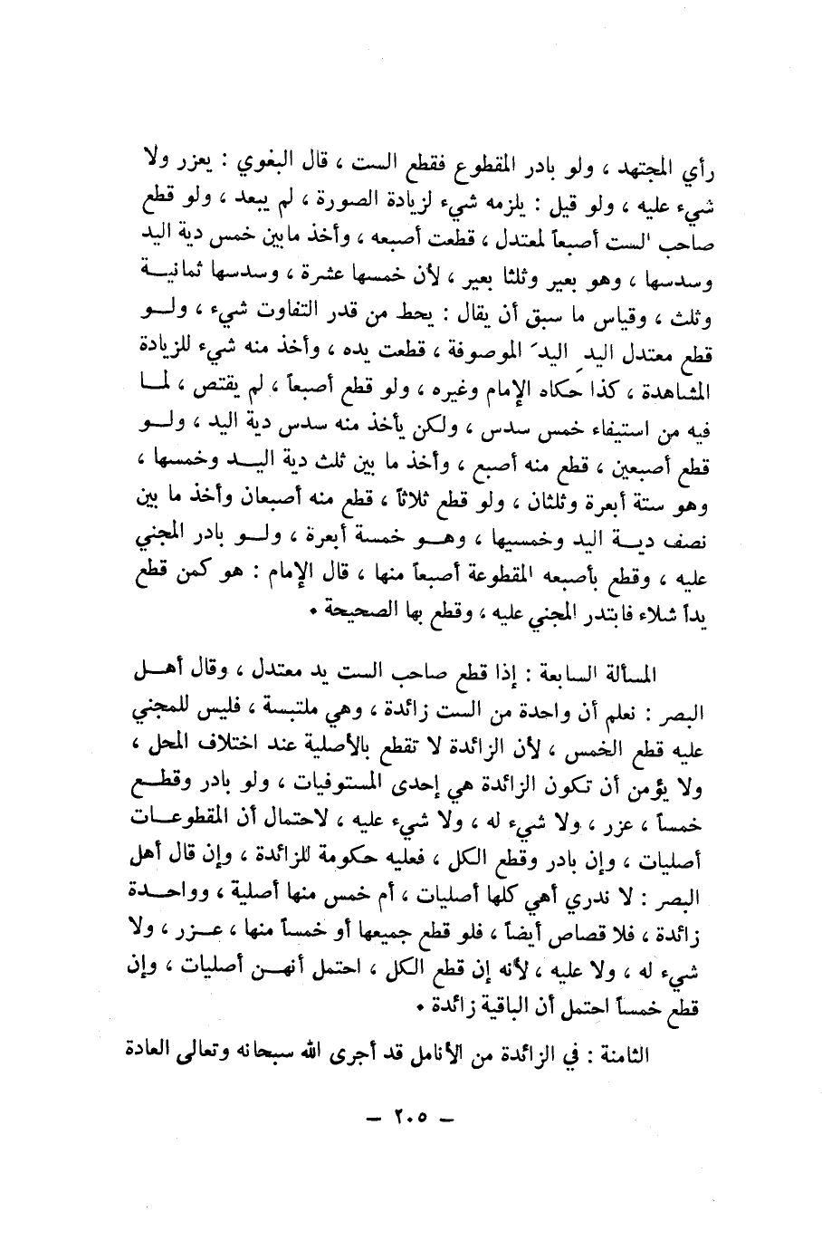 رَأْيِ الْمُجْتَهِدِ، وَلَوْ بَادَرَ الْمَقْطُوعُ فَقَطَعَ السِّتَّ، قَالَ الْبَغَوِيُّ: يُعَزَّرُ وَلَا شَيْءَ عَلَيْهِ، وَلَوْ قِيلَ: يَلْزَمُهُ شَيْءٌ لِزِيَادَةِ الصُّورَةِ، لَمْ يَبْعُدْ، وَلَوْ قَطَعَ صَاحِبُ السِّتِّ أُصْبُعًا لِمُعْتَدِلٍ، قُطِعَتْ أُصْبُعُهُ، وَأَخَذَ مَا بَيْنَ خُمُسِ دِيَةِ الْيَدِ وَسُدُسِهَا، وَهُوَ بَعِيرٌ وَثُلُثَا بِعِيرٍ، لِأَنَّ خُمُسُهَا عَشَرَةٌ، وَسُدُسُهَا ثَمَانِيَةٌ وَثُلُثٌ.