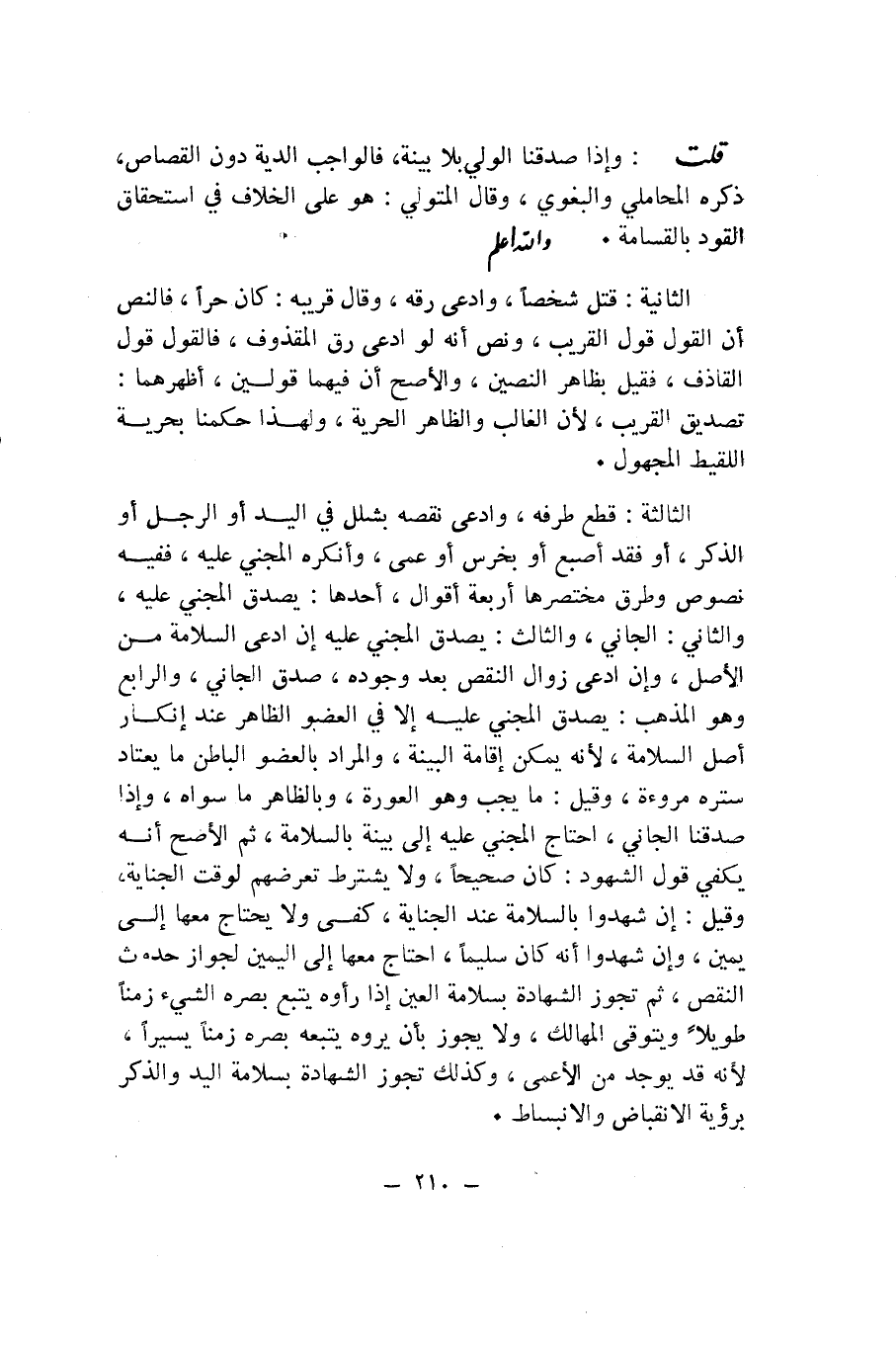 ثُمَّ الْأَصَحُّ أَنَّهُ يَكْفِي قَوْلُ الشُّهُودِ: كَانَ صَحِيحًا، وَلَا يُشْتَرَطُ تَعَرُّضُهُمْ لِوَقْتِ الْجِنَايَةِ، وَقِيلَ: إِنْ شَهِدُوا بِالسَّلَامَةِ عِنْدَ الْجِنَايَةِ، كَفَى وَلَا يَحْتَاجُ مَعَهَا إِلَى يَمِينٍ، وَإِنْ شَهِدُوا أَنَّهُ كَانَ سَلِيمًا، احْتَاجَ مَعَهَا إِلَى الْيَمِينِ لِجَوَازِ حُدُوثِ النَّقْصِ.