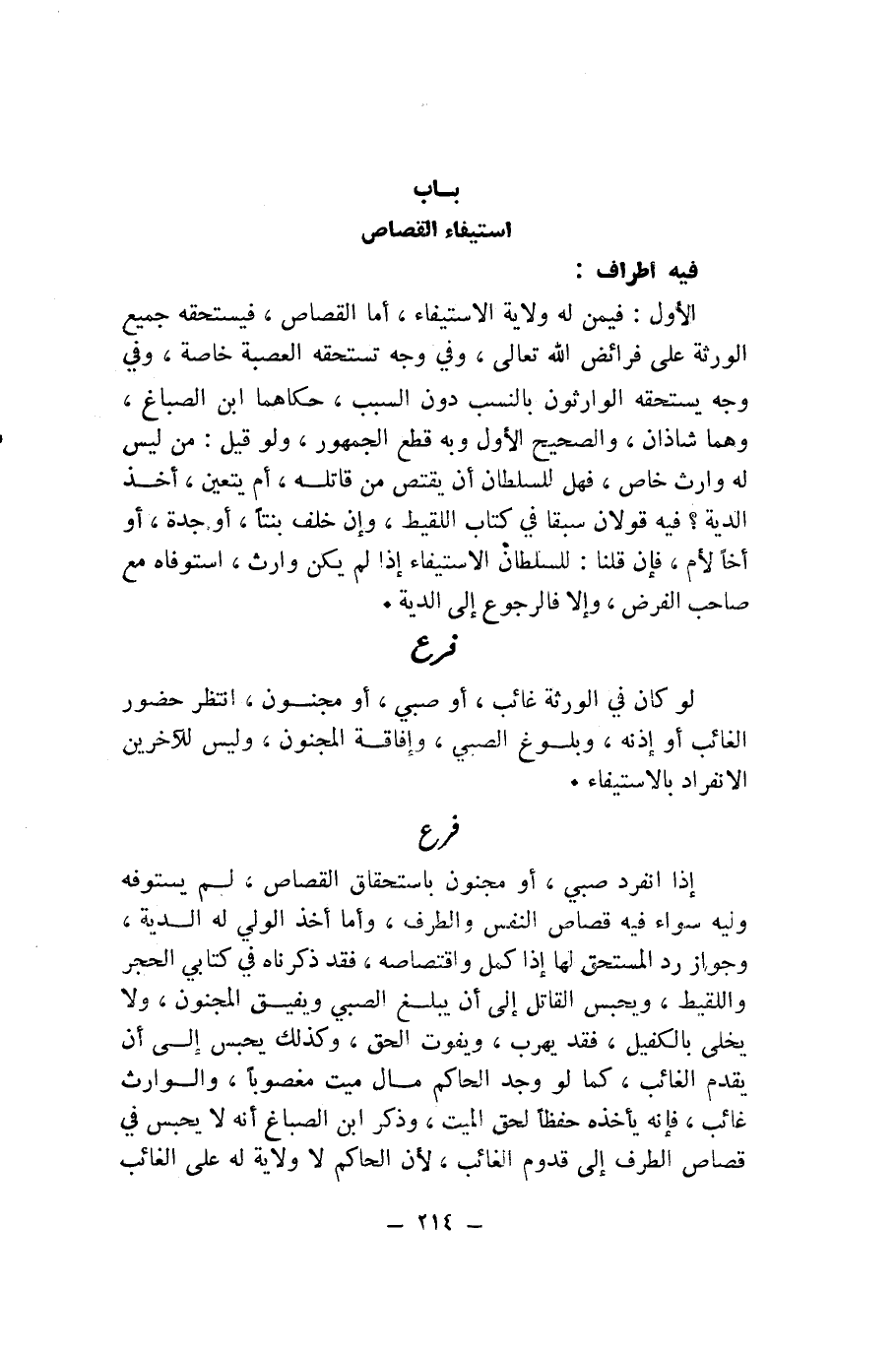 الْأَوَّلُ: فِيمَنْ لَهُ وِلَايَةُ الِاسْتِيفَاءِ، أَمَّا الْقِصَاصُ، فَيَسْتَحِقُّهُ جَمِيعُ الْوَرَثَةِ عَلَى فَرَائِضِ اللَّهِ تَعَالَى، وَفِي وَجْهٍ تَسْتَحِقُّهُ الْعَصَبَةُ خَاصَّةً، وَفِي وَجْهٍ يَسْتَحِقُّهُ الْوَارِثُونَ بِالنَّسَبِ دُونَ السَّبَبِ، حَكَاهُمَا ابْنُ الصَّبَّاغِ، وَهُمَا شَاذَّانِ.