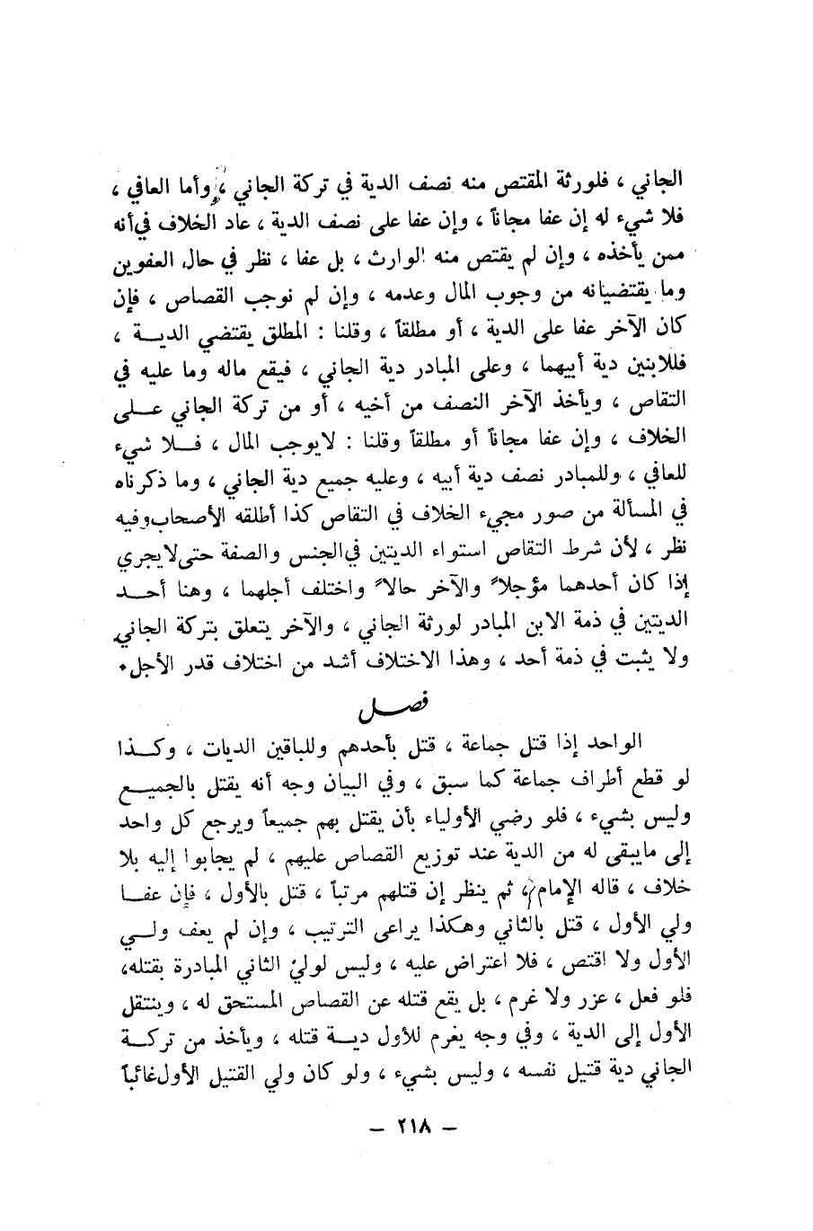 وَإِنْ لَمْ يَقْتَصَّ مِنْهُ الْوَارِثُ، بَلْ عَفَا، نُظِرَ فِي حَالِ الْعَفْوَيْنِ وَمَا يَقْتَضِيَانِهِ مِنْ وُجُوبِ الْمَالِ وَعَدَمِهِ، وَإِنْ لَمْ نُوجِبِ الْقِصَاصَ، فَإِنْ كَانَ الْآخَرُ عَفَا عَلَى الدِّيَةِ، أَوْ مُطْلَقًا، وَقُلْنَا: الْمُطْلَقُ يَقْتَضِي الدِّيَةَ، فَلِلِابْنَيْنِ دِيَةُ أَبِيهِمَا، وَعَلَى الْمُبَادِرِ دِيَةُ الْجَانِي، فَيَقَعُ مَا لَهُ وَمَا عَلَيْهِ فِي الْتَّقَاصِّ، وَيَأْخُذُ الْآخَرُ النِّصْفَ مِنْ أَخِيهِ، أَوْ مِنْ تَرِكَةِ الْجَانِي عَلَى الْخِلَافِ.