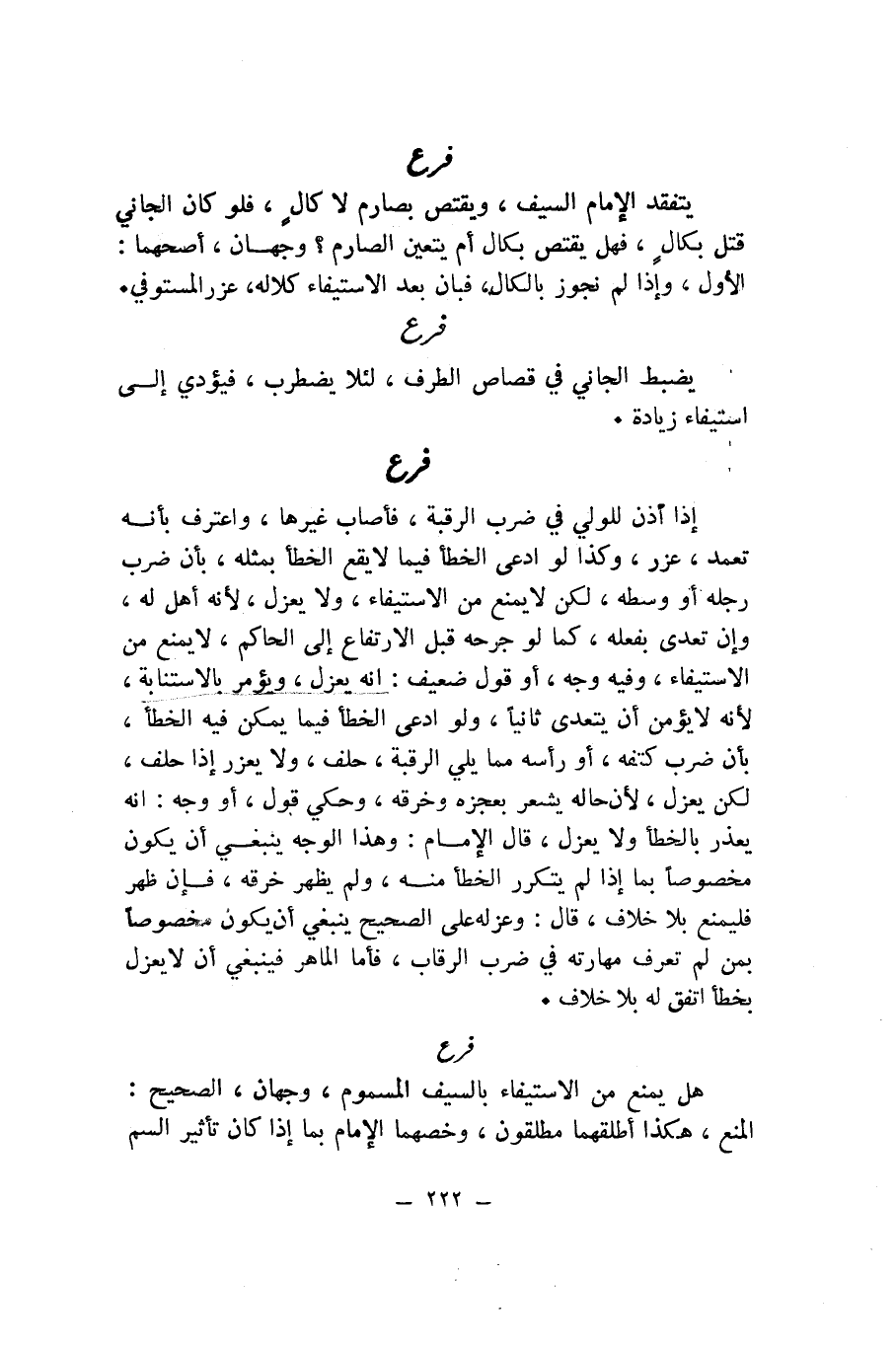 فَإِنْ ظَهَرَ فَلْيُمْنَعْ بِلَا خِلَافٍ، قَالَ: وَعَزْلُهُ عَلَى الصَّحِيحِ يَنْبَغِي أَنْ يَكُونَ مَخْصُوصًا بِمَنْ لَمْ تُعْرَفْ مَهَارَتُهُ فِي ضَرْبِ الرِّقَابِ، فَأَمَّا الْمَاهِرُ فَيَنْبَغِي أَنْ لَا يُعْزَلَ بِخَطَأٍ اتَّفَقَ لَهُ بِلَا خِلَافٍ.