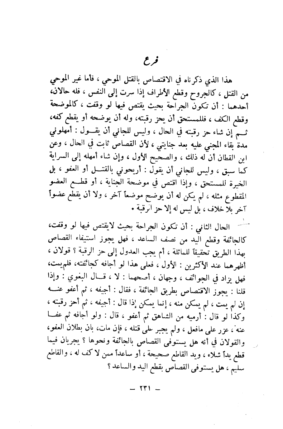 هَذَا الَّذِي ذَكَرْنَاهُ فِي الِاقْتِصَاصِ بِالْقَتْلِ الْمُوحِي، فَأَمَّا غَيْرُ الْمُوحِي مِنَ الْقَتْلِ، كَالْجُرُوحِ وَقَطْعِ الْأَطْرَافِ إِذَا سَرَتْ إِلَى النَّفْسِ، فَلَهُ حَالَانِ.