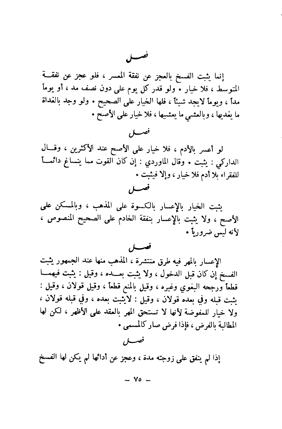 الْإِعْسَارُ بِالْمَهْرِ فِيهِ طُرُقٌ مُنْتَشِرَةٌ، الْمَذْهَبُ مِنْهَا عِنْدَ الْجُمْهُورِ يَثْبُتُ الْفَسْخُ إِنْ كَانَ قَبْلَ الدُّخُولِ، وَلَا يَثْبُتُ بَعْدَهُ، وَقِيلَ: يَثْبُتُ فِيهِمَا قَطْعًا وَرَجَّحَهُ الْبَغَوِيُّ وَغَيْرُهُ، وَقِيلَ بِالْمَنْعِ قَطْعًا، وَقِيلَ قَوْلَانِ، وَقِيلَ: يَثْبُتُ قَبْلَهُ وَفِي بَعْدِهِ قَوْلَانِ، وَقِيلَ: لَا يَثْبُتُ بَعْدَهُ، وَفِي قَبْلِهِ قَوْلَانِ، وَلَا خِيَارَ لِلْمُفَوِّضَةِ لِأَنَّهَا لَا تَسْتَحِقُّ الْمَهْرَ بِالْعَقْدِ عَلَى الْأَظْهَرِ، لَكِنْ لَهَا الْمُطَالَبَةُ بِالْفَرْضِ، فَإِذَا فَرَضَ صَارَ كَالْمُسَمَّى.
