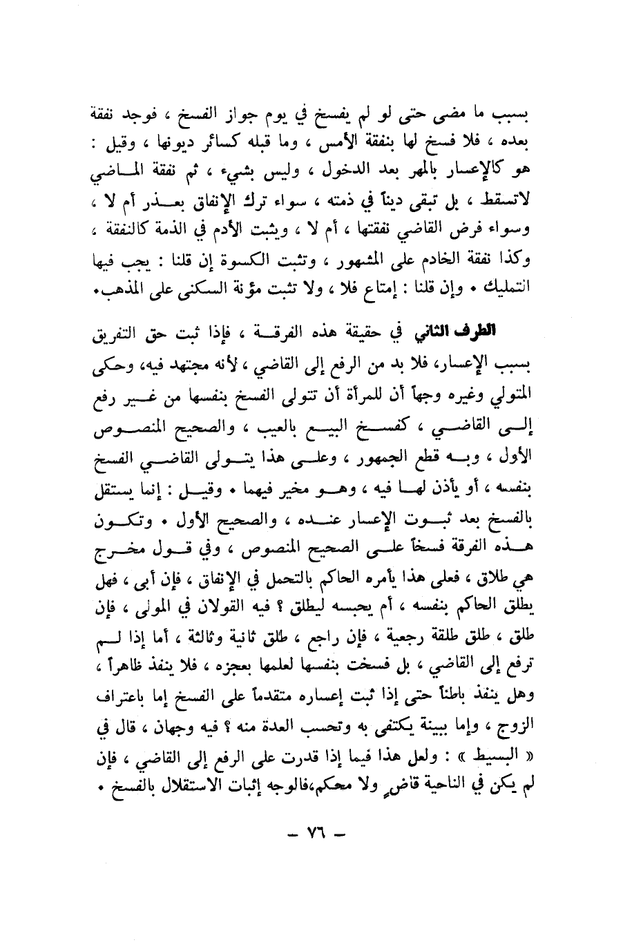 الطَّرَفُ الثَّانِي: فِي حَقِيقَةِ هَذِهِ الْفُرْقَةِ، فَإِذَا ثَبَتَ حَقُّ التَّفْرِيقِ بِسَبَبِ الْإِعْسَارِ، فَلَا بُدَّ مِنَ الرَّفْعِ إِلَى الْقَاضِي، لِأَنَّهُ مُجْتَهِدٌ فِيهِ، وَحَكَى الْمُتَوَلِّي وَغَيْرُهُ وَجْهًا أَنَّ لِلْمَرْأَةِ أَنْ تَتَوَلَّى الْفَسْخَ بِنَفْسِهَا مِنْ غَيْرِ رَفْعٍ إِلَى الْقَاضِي، كَفَسْخِ الْبَيْعِ بِالْعَيْبِ، وَالصَّحِيحُ الْمَنْصُوصُ الْأَوَّلُ، وَبِهِ قَطَعَ الْجُمْهُورُ، وَعَلَى هَذَا يَتَوَلَّى الْقَاضِي الْفَسْخَ بِنَفْسِهِ، أَوْ يَأْذَنُ لَهَا فِيهِ، وَهُوَ مُخَيَّرٌ فِيهِمَا. وَقِيلَ: إِنَّمَا يَسْتَقِلُّ بِالْفَسْخِ بَعْدَ ثُبُوتِ الْإِعْسَارِ عِنْدَهُ، وَالصَّحِيحُ الْأَوَّلُ. وَتَكُونُ هَذِهِ الْفُرْقَةُ فَسْخًا عَلَى الصَّحِيحِ الْمَنْصُوصِ، وَفِي قَوْلٍ مُخَرَّجٍ هِيَ طَلَاقٌ، فَعَلَى هَذَا يَأْمُرُهُ الْحَاكِمُ بِالتَّحَمُّلِ فِي الْإِنْفَاقِ، فَإِنْ أَبَى، فَهَلْ يُطَلِّقُ الْحَاكِمُ بِنَفْسِهِ، أَمْ يَحْبِسُهُ لِيُطَلِّقَ؟ فِيهِ الْقَوْلَانِ فِي الْمَوْلَى، فَإِنْ طَلَّقَ، طَلَّقَ طَلْقَةً رَجْعِيَّةً، فَإِنْ رَاجَعَ، طَلَّقَ ثَانِيَةً وَثَالِثَةً، أَمَّا إِذَا لَمْ تَرْفَعْ إِلَى الْقَاضِي، بَلْ فَسَخَتْ بِنَفْسِهَا لِعِلْمِهَا بِعَجْزِهِ، فَلَا يُنَفَّذُ ظَاهِرًا، وَهَلْ يُنَفَّذُ بَاطِنًا حَتَّى إِذَا ثَبَتَ إِعْسَارُهُ مُتَقَدِّمًا عَلَى الْفَسْخِ إِمَّا بِاعْتِرَافِ الزَّوْجِ، وَإِمَّا بِبَيِّنَةٍ يُكْتَفَى بِهِ وَتُحْسَبُ الْعِدَّةُ مِنْهُ؟ فِيهِ وَجْهَانِ، قَالَ فِي «الْبَسِيطِ» : وَلَعَلَّ هَذَا فِيمَا إِذَا قَدَرَتْ عَلَى الرَّفْعِ إِلَى الْقَاضِي، فَإِنْ لَمْ يَكُنْ فِي النَّاحِيَةِ قَاضٍ وَلَا مُحَكَّمٌ، فَالْوَجْهُ إِثْبَاتُ الِاسْتِقْلَالِ بِالْفَسْخِ.