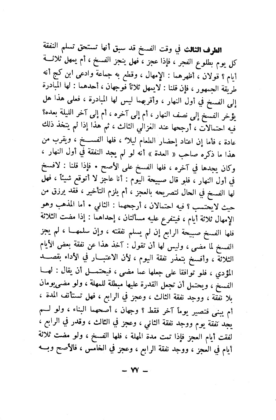 الطَّرَفُ الثَّالِثُ: فِي وَقْتِ الْفَسْخِ قَدْ سَبَقَ أَنَّهَا تَسْتَحِقُّ تَسَلُّمَ النَّفَقَةِ كُلَّ يَوْمٍ بِطُلُوعِ الْفَجْرِ، فَإِذَا عَجَزَ، فَهَلْ يُنْجِزُ الْفَسْخَ، أَمْ يُمْهَلُ ثَلَاثَةَ أَيَّامٍ؟ قَوْلَانِ: أَظْهَرُهُمَا: الْإِمْهَالُ، وَقَطَعَ بِهِ جَمَاعَةٌ وَادَّعَى ابْنُ كَجٍّ أَنَّهُ طَرِيقَةُ الْجُمْهُورِ، فَإِنْ قُلْنَا: لَا يُمْهَلُ ثَلَاثًا فَوَجْهَانِ: أَحَدُهُمَا: لَهَا الْمُبَادَرَةُ إِلَى الْفَسْخِ فِي أَوَّلِ النَّهَارِ، وَأَقْرَبُهُمَا لَيْسَ لَهَا الْمُبَادَرَةُ، فَعَلَى هَذَا هَلْ يُؤَخَّرُ الْفَسْخُ إِلَى نِصْفِ النَّهَارِ، أَمْ إِلَى آخِرِهِ، أَمْ إِلَى آخَرِ اللَّيْلَةِ بَعْدَهُ؟ فِيهِ احْتِمَالَاتٌ: أَرْجَحُهَا عِنْدَ الْغَزَالِيِّ الثَّالِثُ، ثُمَّ هَذَا إِذَا لَمْ يَتَّخِذْ ذَلِكَ عَادَةً، فَأَمَّا إِنِ اعْتَادَ إِحْضَارَ الطَّعَامِ لَيْلًا، فَلَهَا الْفَسْخُ، وَيَقْرُبُ مِنْ هَذَا مَا ذَكَرَهُ صَاحِبُ «الْعُدَّةِ» أَنَّهُ لَوْ لَمْ يَجِدِ النَّفَقَةَ فِي أَوَّلِ النَّهَارِ، وَكَانَ يَجِدُهَا فِي آخِرِهِ، فَلَهَا الْفَسْخُ عَلَى الْأَصَحِّ. فَإِذَا قُلْنَا: لَا فَسْخَ فِي أَوَّلِ النَّهَارِ، فَلَوْ قَالَ صَبِيحَةَ الْيَوْمِ: أَنَا عَاجِزٌ لَا أَتَوَقَّعُ شَيْئًا، فَهَلْ لَهَا الْفَسْخُ فِي الْحَالِ لِتَصْرِيحِهِ بِالْعَجْزِ، أَمْ يَلْزَمُ التَّأْخِيرُ، فَقَدْ يُرْزَقُ مِنْ حَيْثُ لَا يَحْتَسِبُ؟ فِيهِ احْتِمَالَانِ: أَرْجَحُهُمَا: الثَّانِي. أَمَّا الْمَذْهَبُ وَهُوَ الْإِمْهَالُ ثَلَاثَةُ أَيَّامٍ، فَيَتَفَرَّعُ عَلَيْهِ مَسْأَلَتَانِ: إِحْدَاهُمَا: إِذَا مَضَتِ الثَّلَاثَةُ فَلَهَا الْفَسْخُ صَبِيحَةَ الرَّابِعِ إِنْ لَمْ يُسَلِّمْ نَفَقَتَهُ، وَإِنْ سَلَّمَهَا، لَمْ يَجُزِ الْفَسْخُ لِمَا مَضَى، وَلَيْسَ لَهَا أَنْ تَقُولَ: آخُذُ هَذَا عَنْ نَفَقَةِ بَعْضِ الْأَيَّامِ الثَّلَاثَةِ، وَأَفْسَخُ بِتَعَذُّرِ نَفَقَةِ الْيَوْمَ، لِأَنَّ الِاعْتِبَارَ فِي الْأَدَاءِ بِقَصْدِ الْمُؤَدِّي، فَلَوْ تَوَافَقَا عَلَى جَعْلِهَا عَمَّا مَضَى، فَيُحْتَمَلُ أَنْ يُقَالَ: لَهَا الْفَسْخُ، وَيُحْتَمَلُ أَنْ تُجْعَلَ الْقُدْرَةُ عَلَيْهَا مُبَطِلَةً لِلْمُهْلَةِ، وَلَوْ مَضَى يَوْمَانِ بِلَا نَفَقَةٍ، وَوَجَدَ نَفَقَةَ الثَّالِثِ، وَعَجَزَ فِي الرَّابِعِ، فَهَلْ تُسْتَأْنَفُ الْمَدَّةُ، أَمْ يُبْنَى فَتَصِيرَ يَوْمًا آخَرَ فَقَطْ؟ وَجْهَانِ: أَصَحُّهُمَا الْبِنَاءُ، وَلَوْ لَمْ يَجِدْ نَفَقَةَ يَوْمٍ وَوَجَدَ نَفَقَةَ الثَّانِي، وَعَجَزَ فِي الثَّالِثِ، وَقَدَرَ فِي الرَّابِعِ، لُفِّقَتْ أَيَّامُ الْعَجْزِ فَإِذَا تَمَّتْ مُدَّةُ الْمُهْلَةِ، فَلَهَا الْفَسْخُ، وَلَوْ مَضَتْ ثَلَاثَةُ أَيَّامٍ فِي الْعَجْزِ، وَوَجَدَ نَفَقَةَ الرَّابِعِ، وَعَجَزَ فِي الْخَامِسِ، فَالْأَصَحُّ وَبِهِ